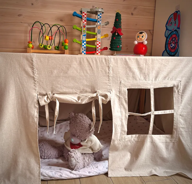 Двухъярусная кровать, письменный стол, настольный футбол, игрушки, настольные игры.