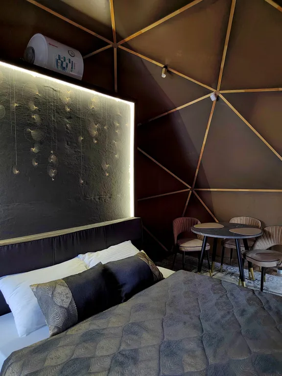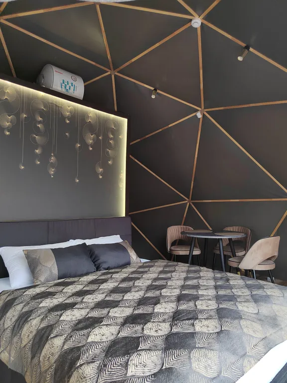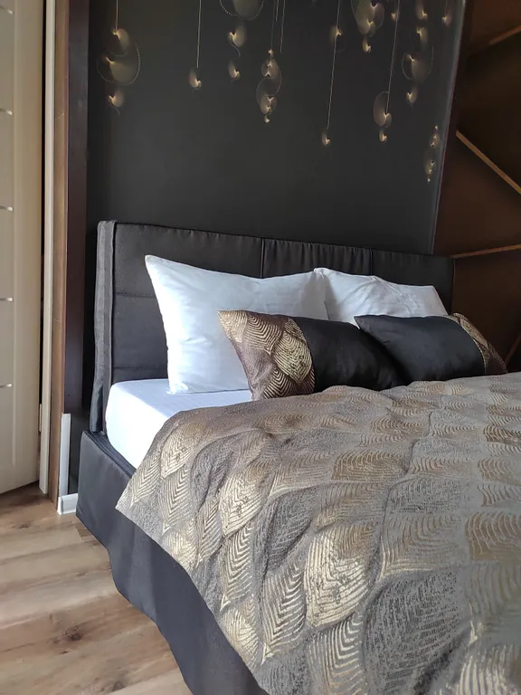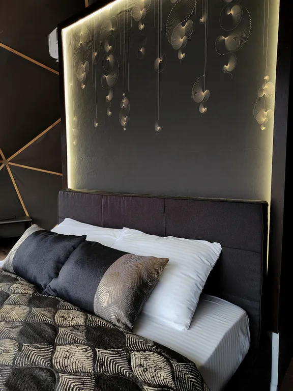 Глубокая тёмная палитра интерьера с лёгкими золотистыми акцентами располагает к тому чтобы выспаться, отдохнуть и расслабиться как следует.