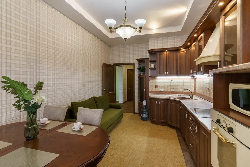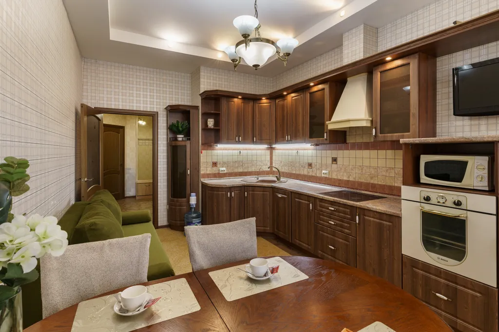 Для комфортного проживания есть вся бытовая техника: электроплита, электрический чайник, микроволновая печь, духовой шкаф. Имеется вся необходимая посуда. Имеется водонагреватель на случай отключения горячей воды.