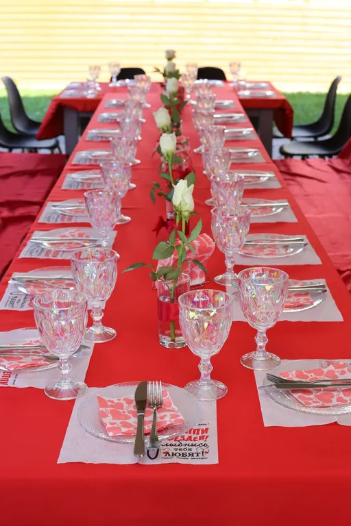 Кухня: вся посуда, тарелки, стаканы, рюмки, ложки, вилки на 20 человек.