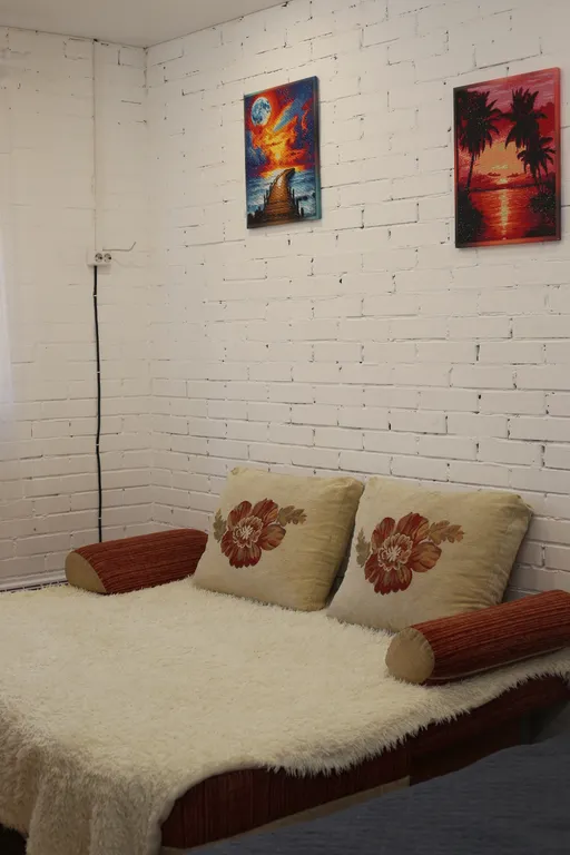 На первом этаже большая кухня-гостиная, которая вмещает до 20 человек, комната (диван и кровать), санузел, душевая кабина.