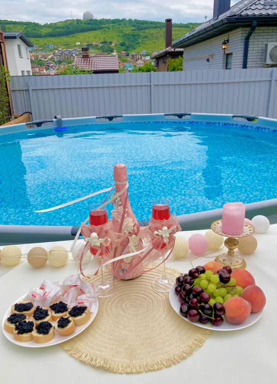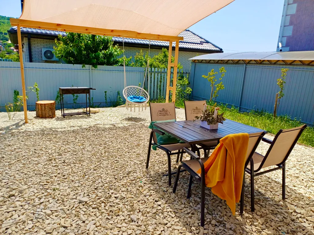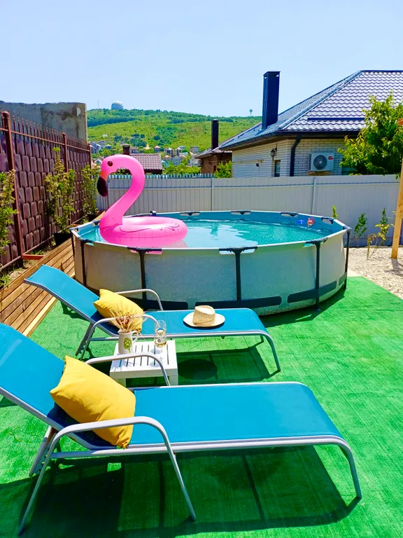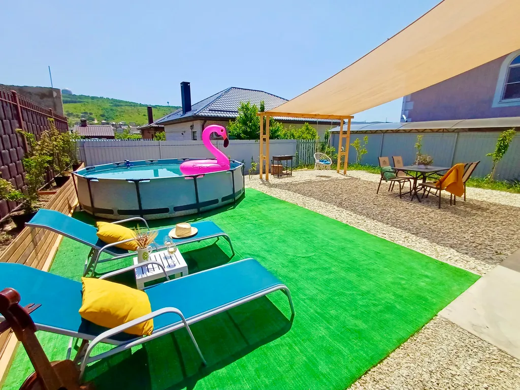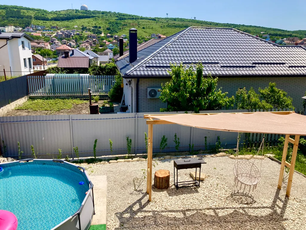 Во дворе обустроена зона отдыха с бассейном и мангалом, парковка на 2 автомобиля.