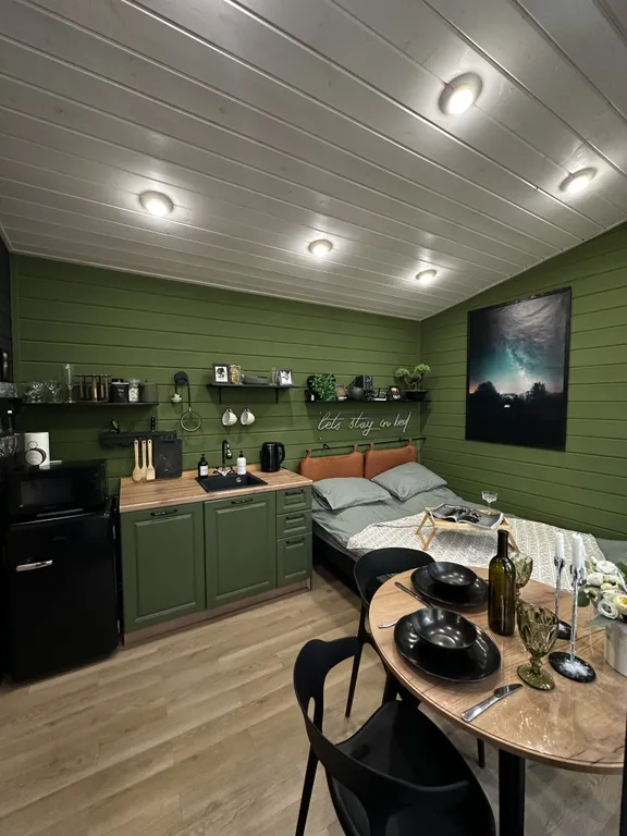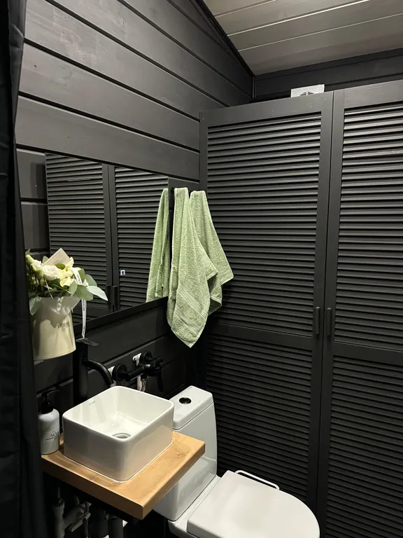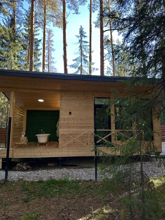 Мы предлагаем тебе современный уютный дом, с большой террасой и горячей ванной прямо на террасе, расположенный на окраине поселка в лесу.