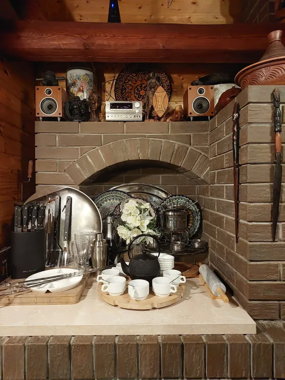 В мангальной зоне: мангал, шампуры, решетки, казан, тандыр, садж, коптильня горячего копчения, подносы для сырых и готовых шашлыков, освещение. Дрова березовые сухие в сетках в цену не входят, есть в наличии по цене стройбазы «Вимс», или можно привезти такие же самим.