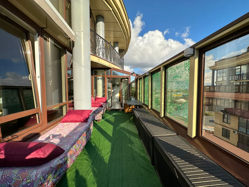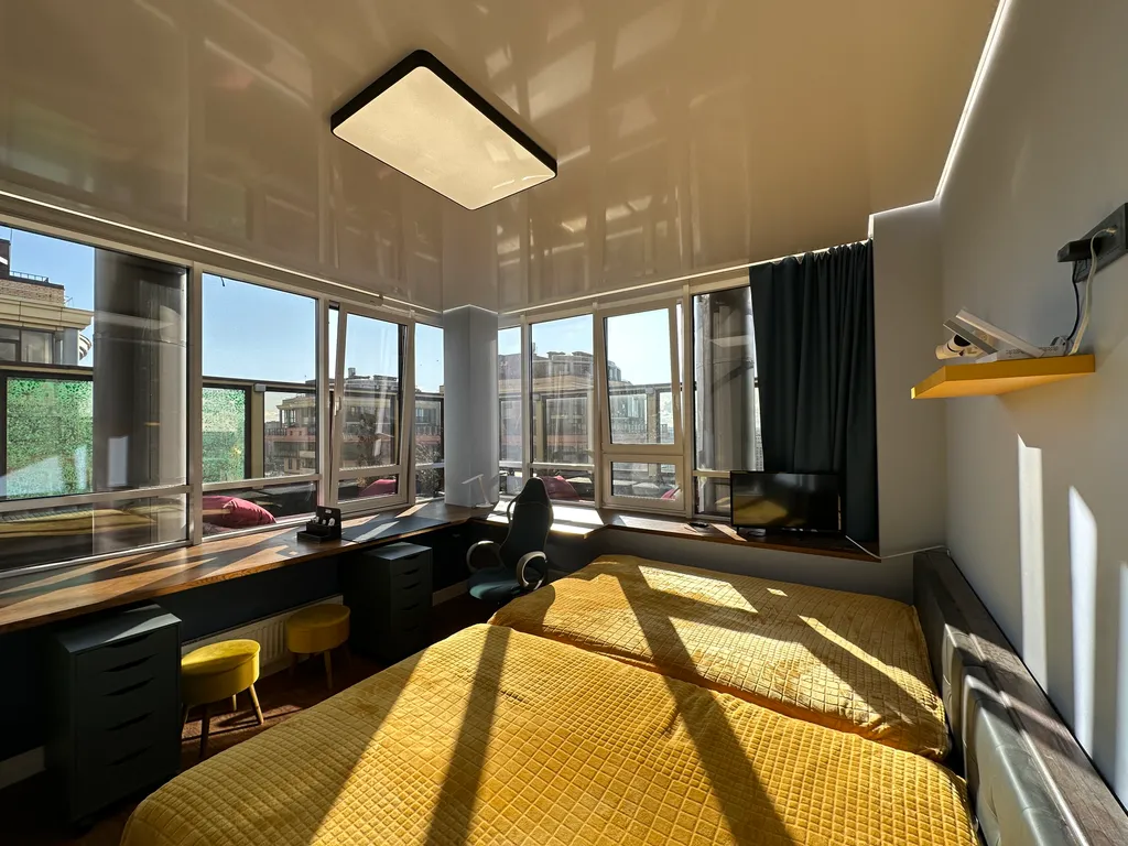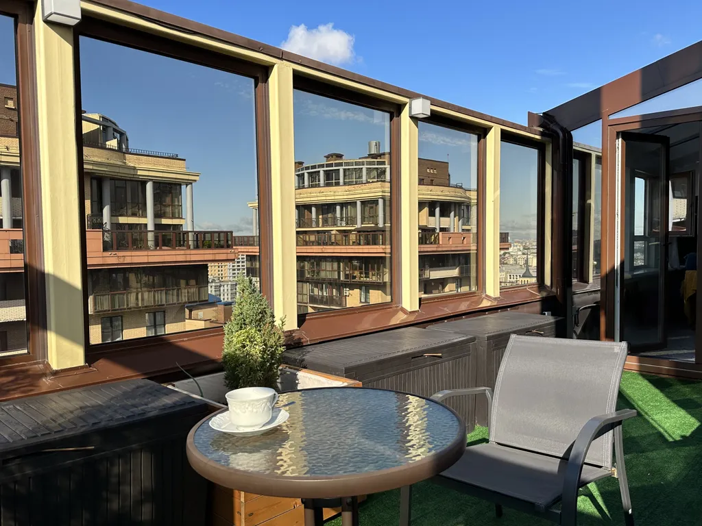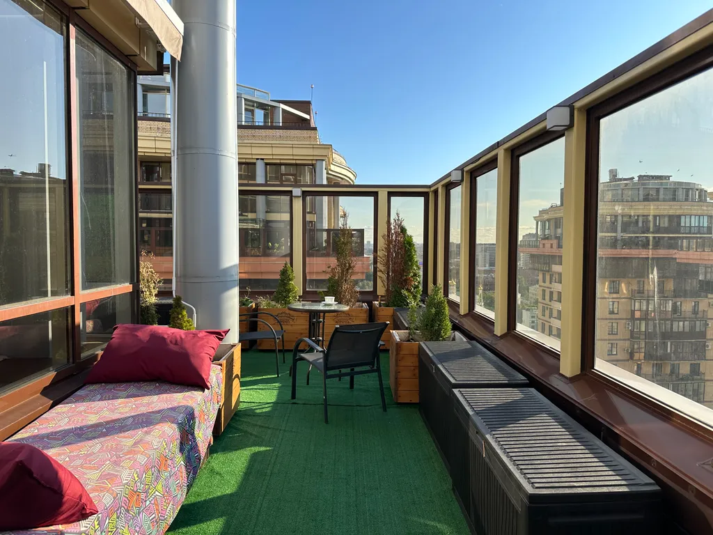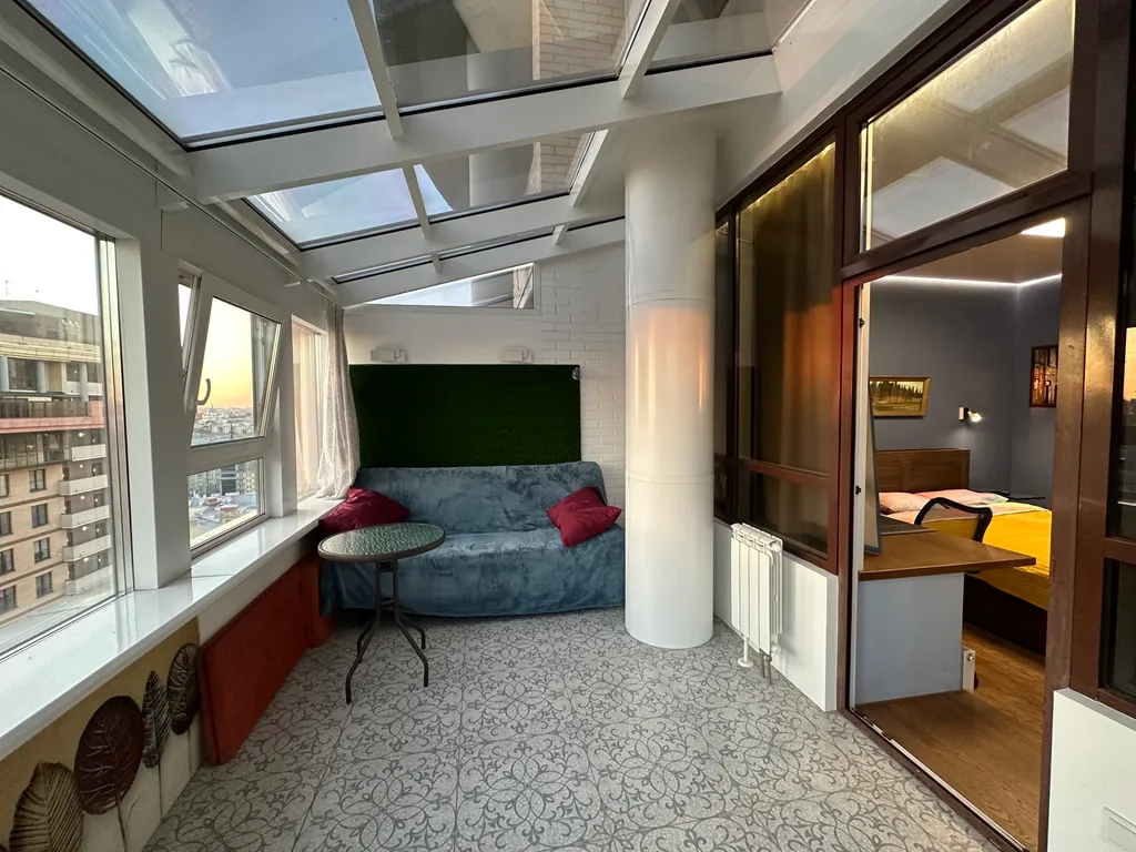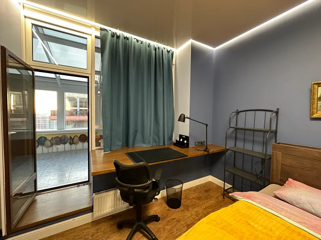 Первая спальня с выходом в остеклённый зимний сад и открытую террасу (40 м²), откуда открываются панорамные виды на город. Здесь можно расслабиться или поработать в тишине.