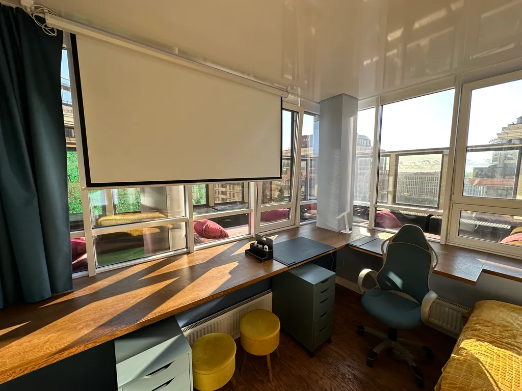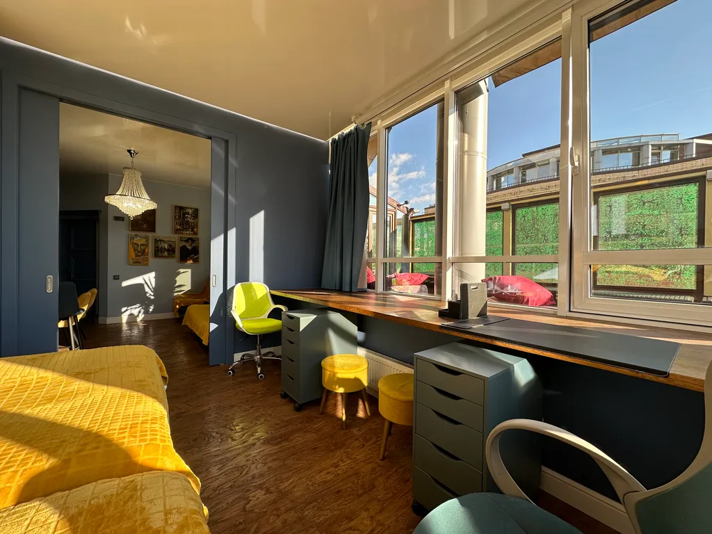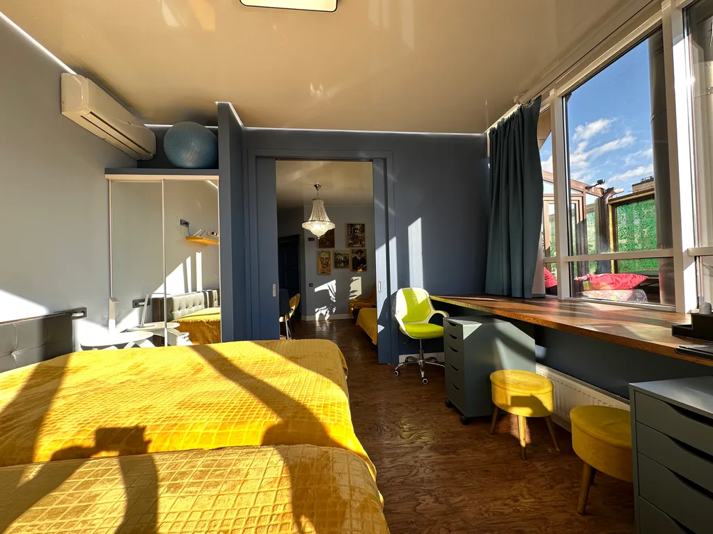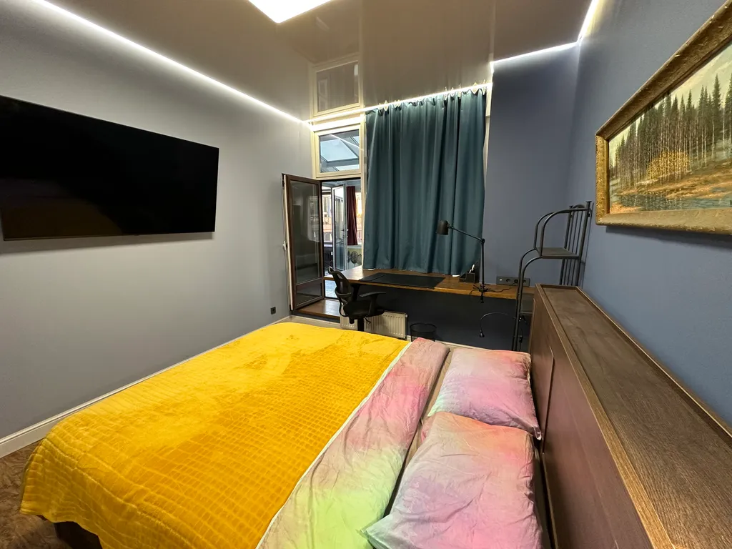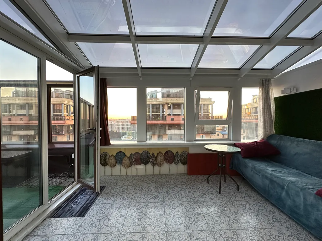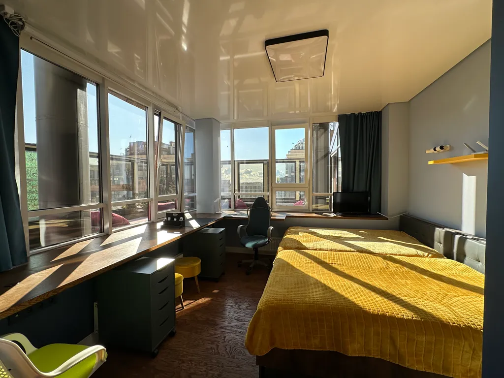 Первая спальня с выходом в остеклённый зимний сад и открытую террасу (40 м²), откуда открываются панорамные виды на город. Здесь можно расслабиться или поработать в тишине.