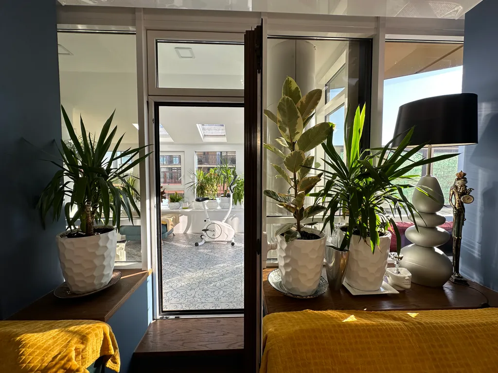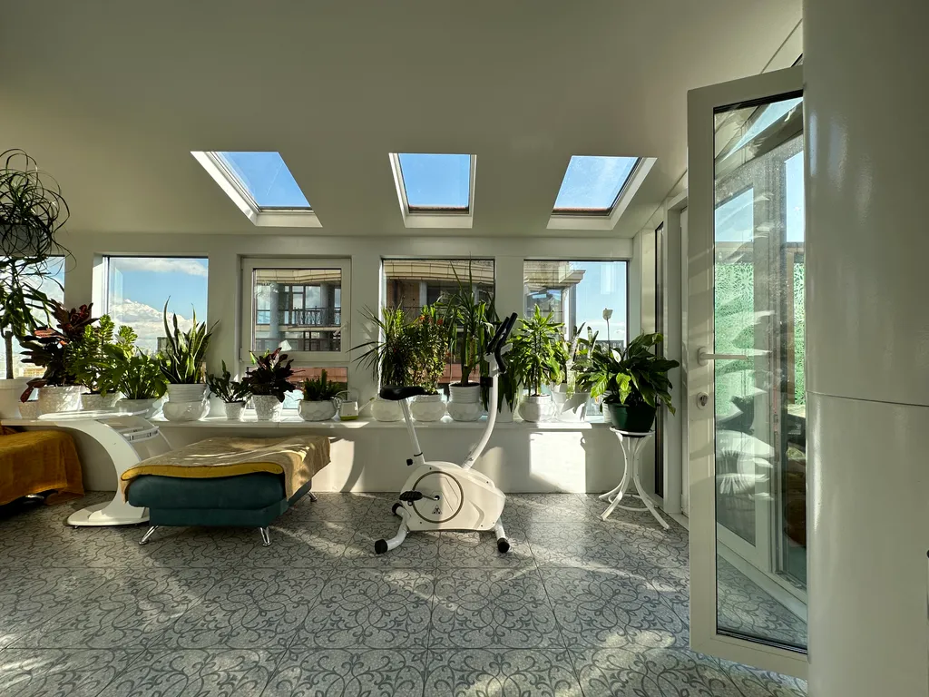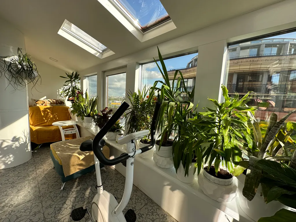Продолжая маршрут, вы входите в оранжерею с фитнес-зоной — место для перезагрузки. Отсюда снова можно вернуться в гостиную и пройти в уединённую вторую спальню с панорамой Петербурга и атмосферой спокойствия — для отдыха или работы.