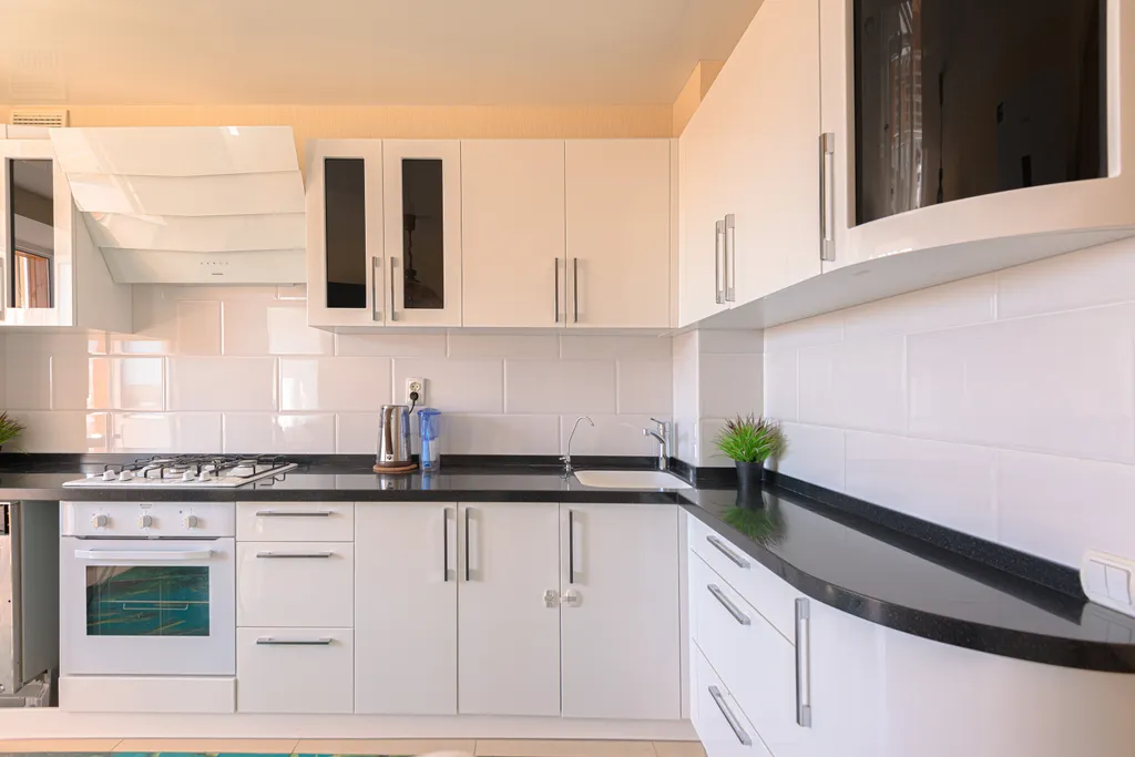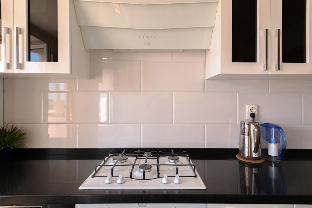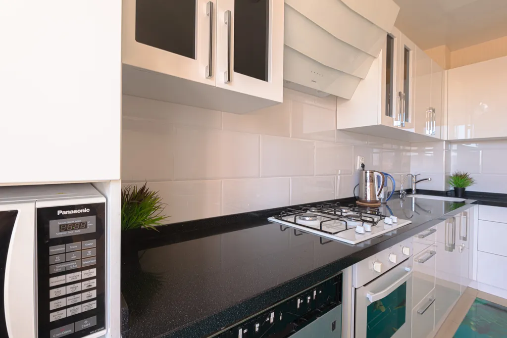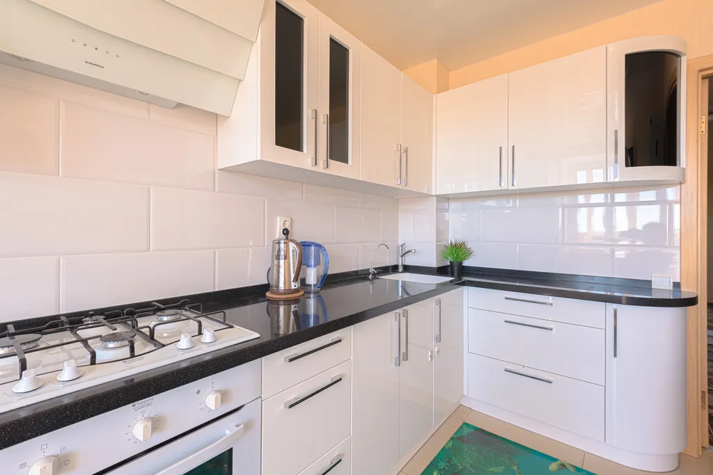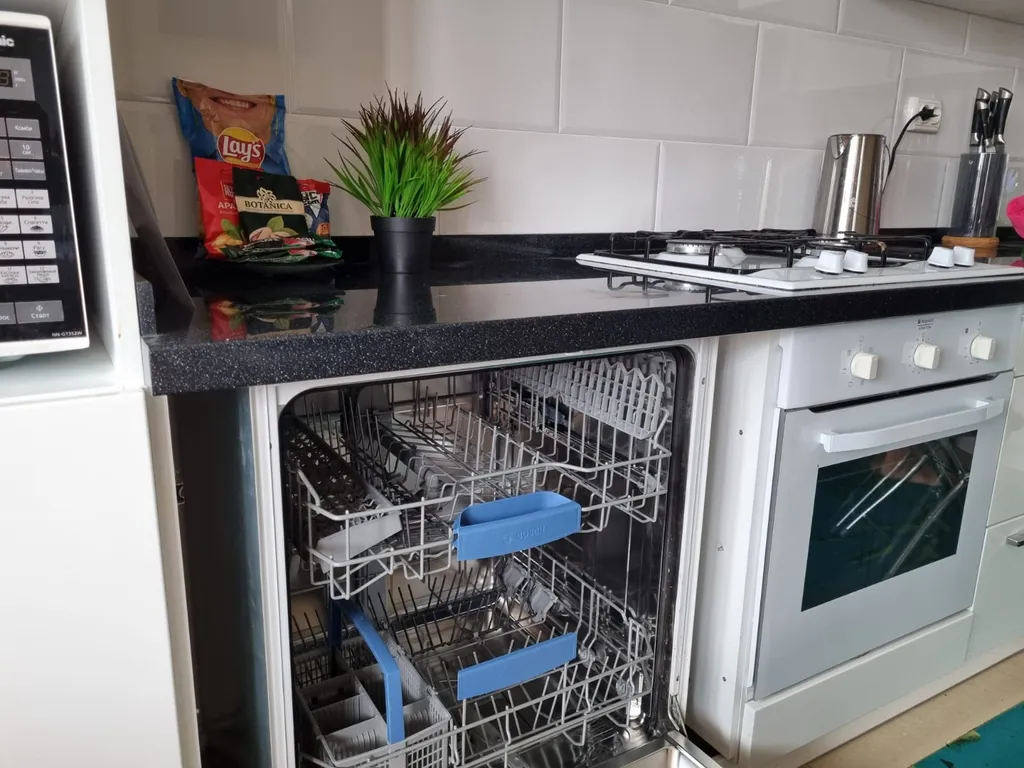 полностью оборудованная кухня (холодильник, газовая варочная панель, духовой шкаф, вытяжка, посудомоечная машина, микроволновая печь, электрический чайник, фильтр для питьевой воды)