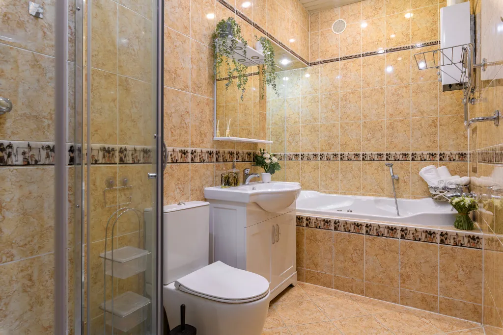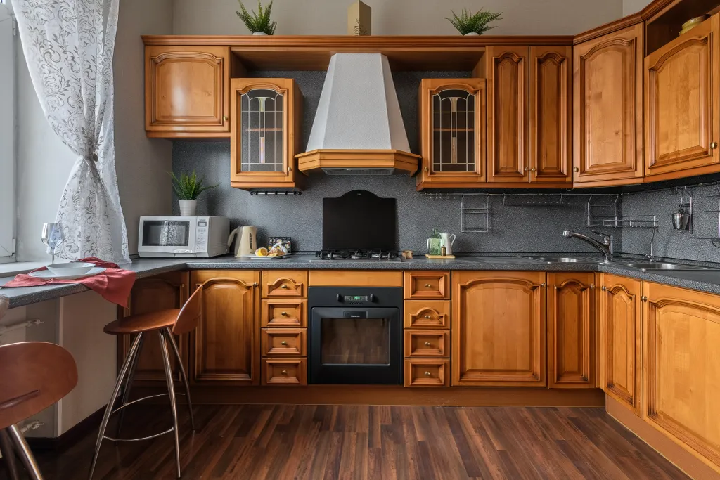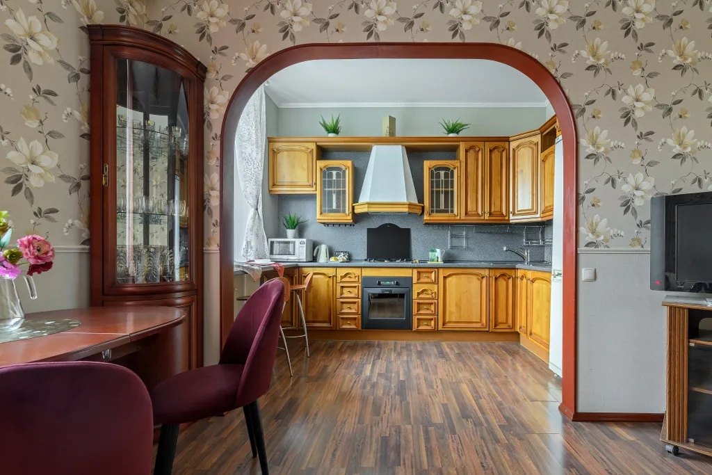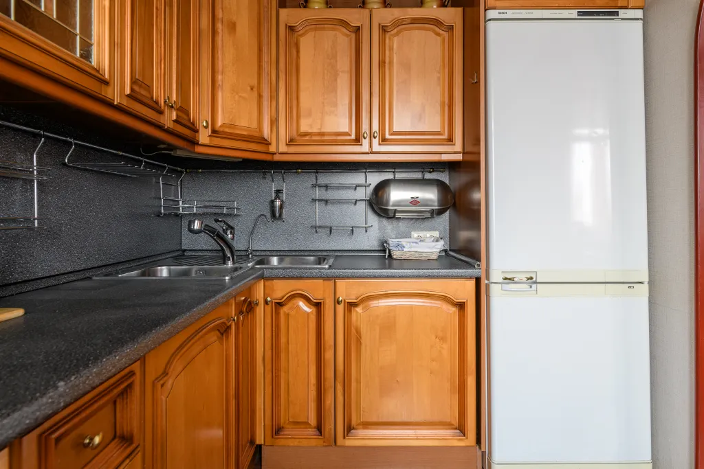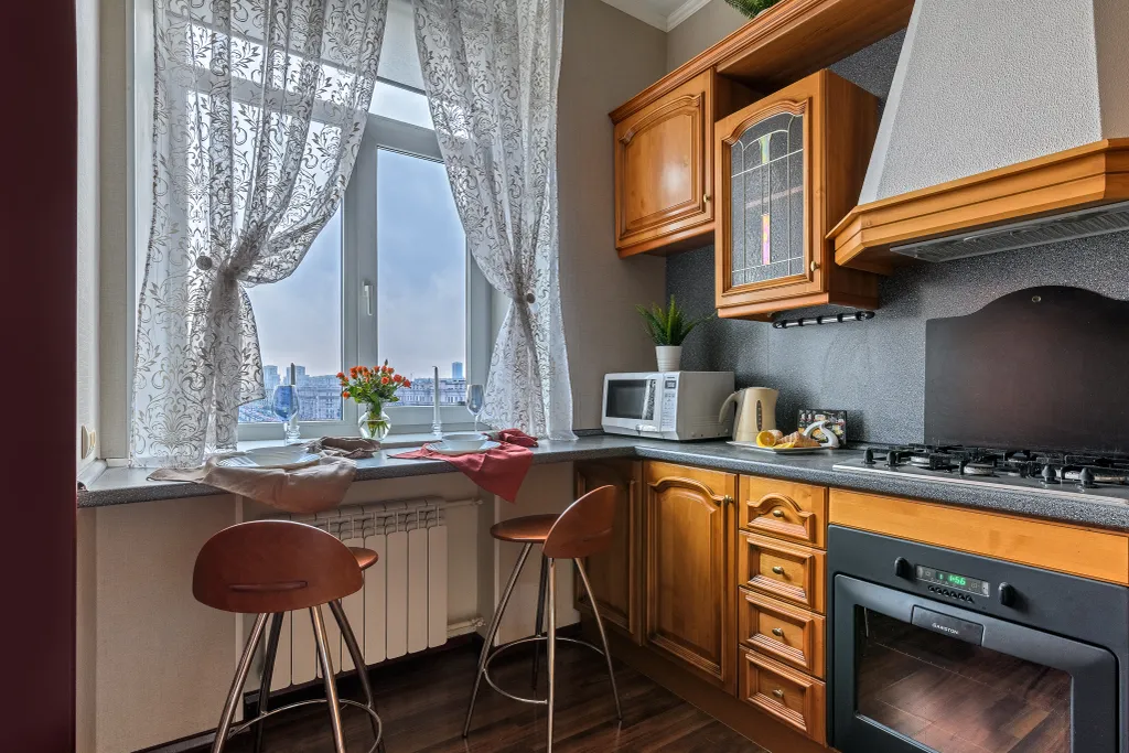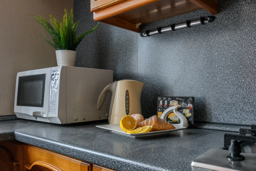 — холодильник с морозильником, газовая плита и духовой шкаф, электрочайник, микроволновая печь, посудомойка