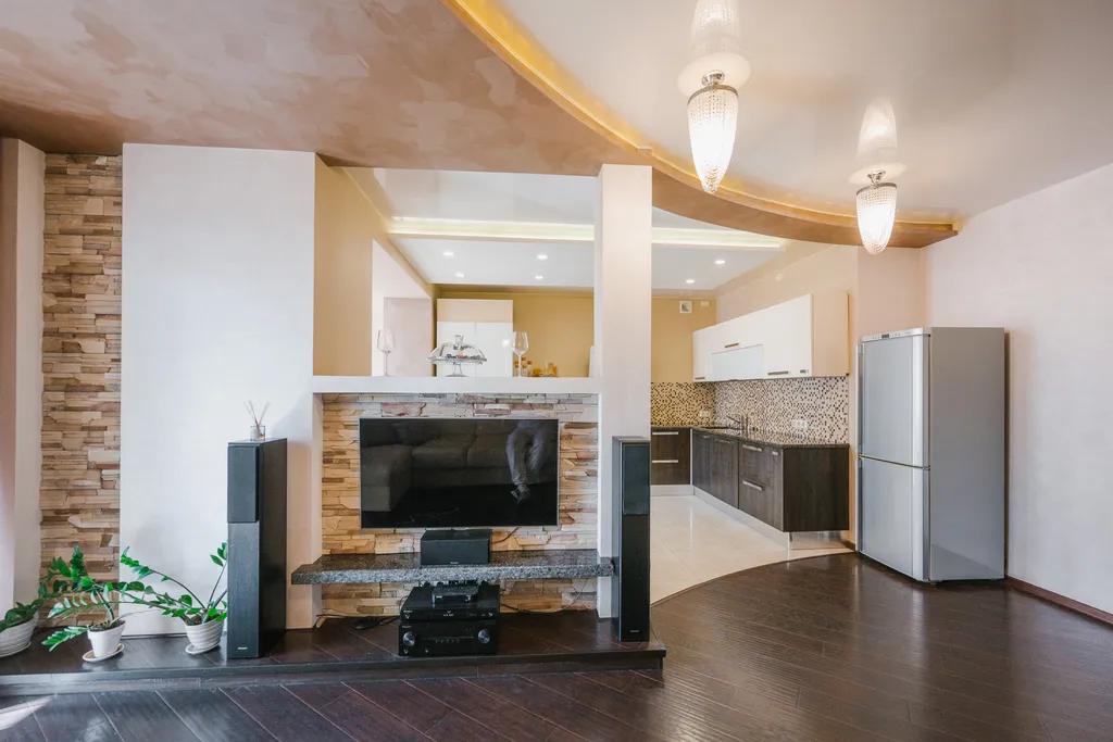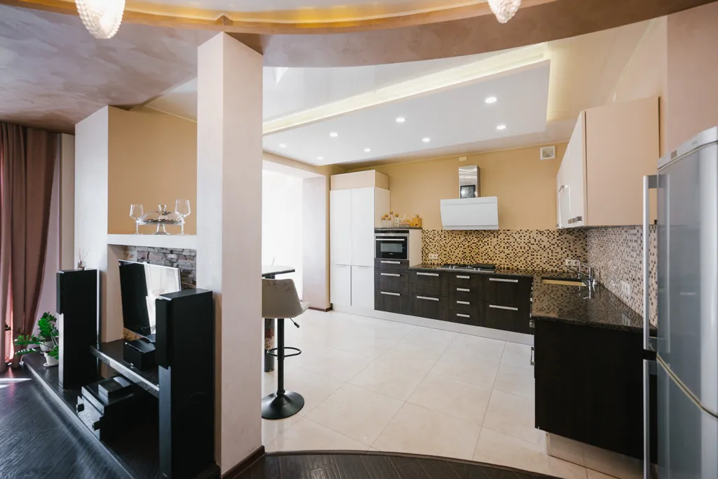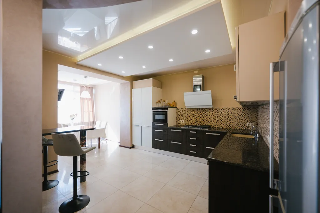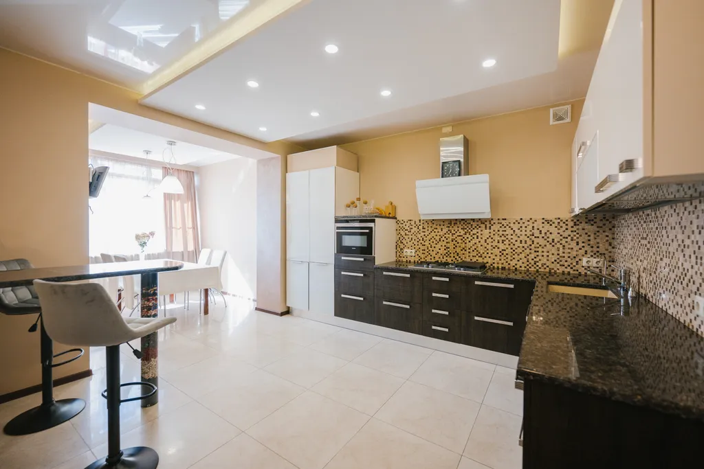 Полноценная кухня со всей необходимой посудой и техникой от ведущих брендов bosch и siemens, включая посудомойку, делают пространство современным и функциональным