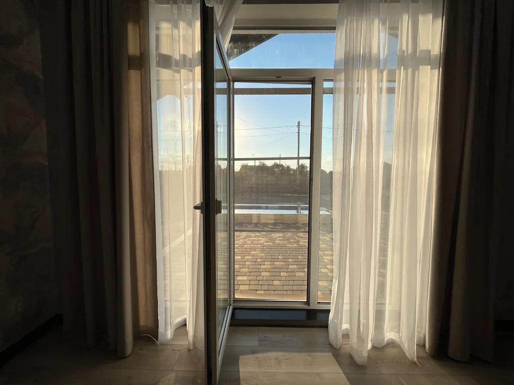 Панорамное окно с выходом на открытую террасу с бассейном.