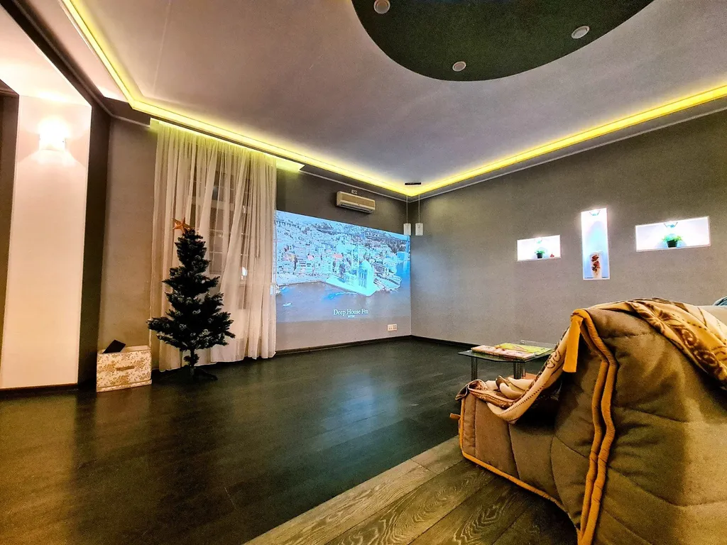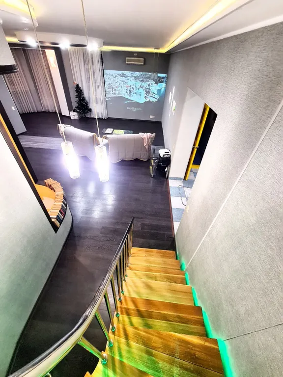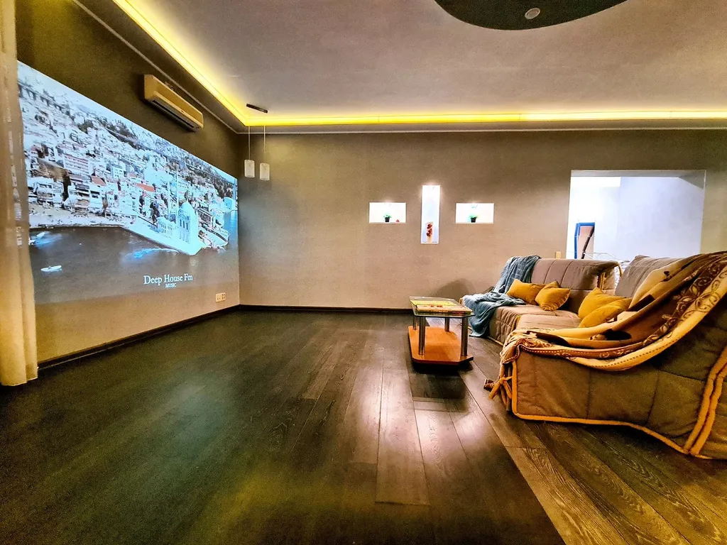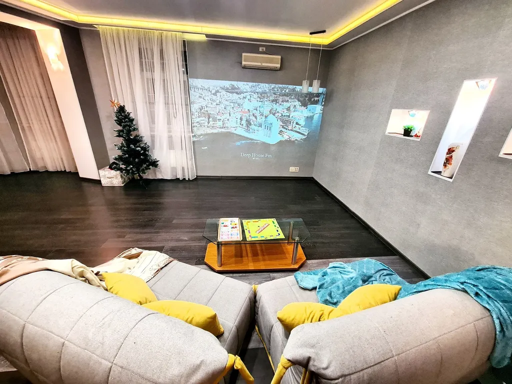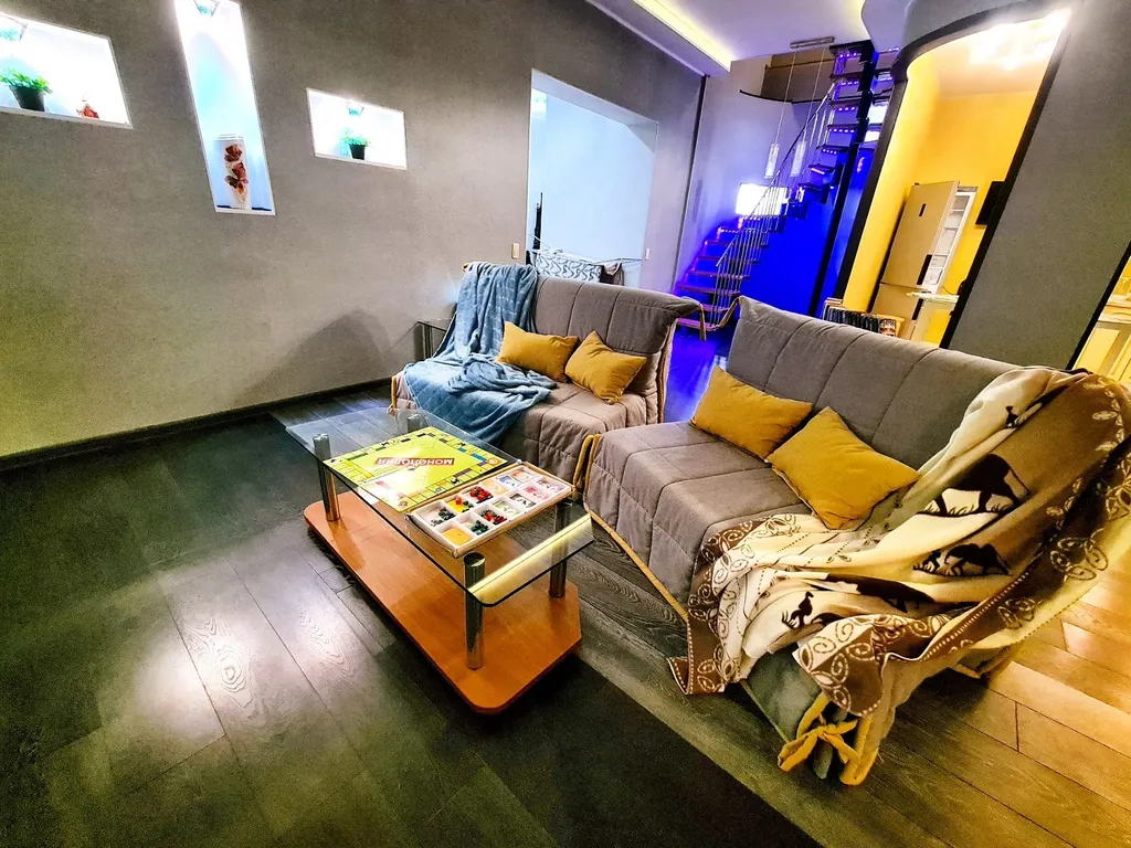 Комфорт и премиальное оснащение. На первом уровне расположена гостиная с домашним кинотеатром с проектором grey-moon — полноценный кинозал для семейного кино и вечеров с 2-мя диванами-полуторками, кухня, сан узел. На втором уровне 2 комнаты с комфортным спальным местом: 2 двуспальные кровати, 2-местный диван позволяют разместить компанию из 8 человек.