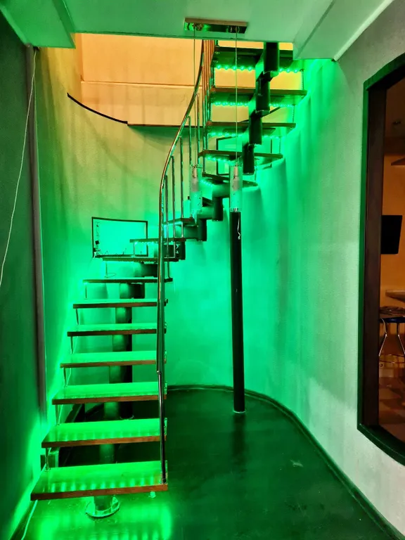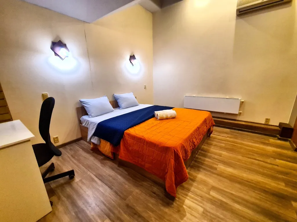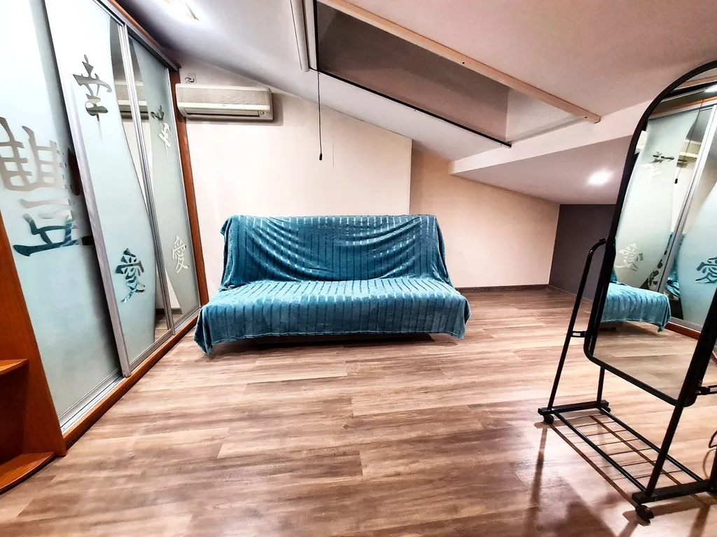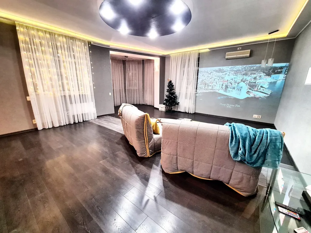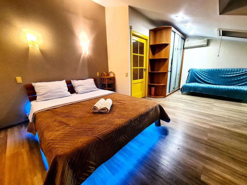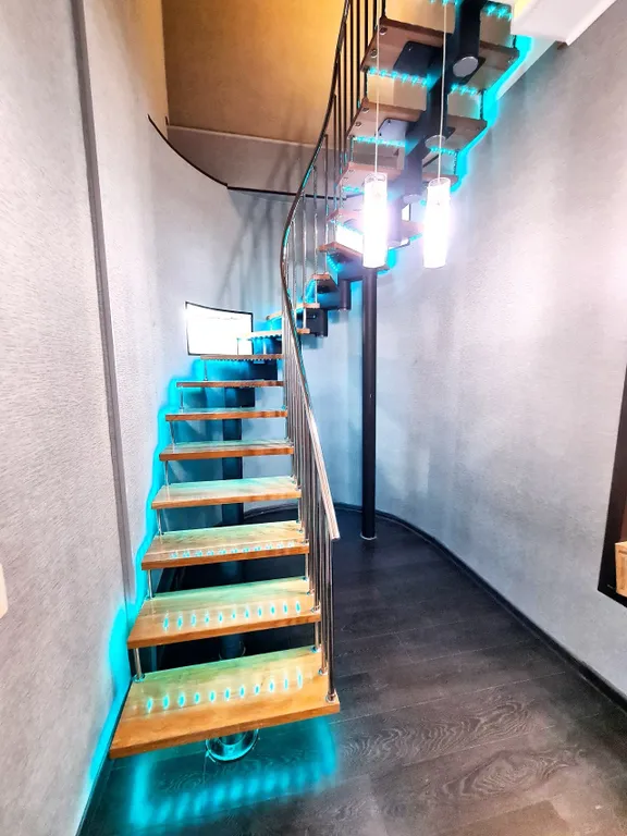 Комфорт и премиальное оснащение. На первом уровне расположена гостиная с домашним кинотеатром с проектором grey-moon — полноценный кинозал для семейного кино и вечеров с 2-мя диванами-полуторками, кухня, сан узел. На втором уровне 2 комнаты с комфортным спальным местом: 2 двуспальные кровати, 2-местный диван позволяют разместить компанию из 8 человек.