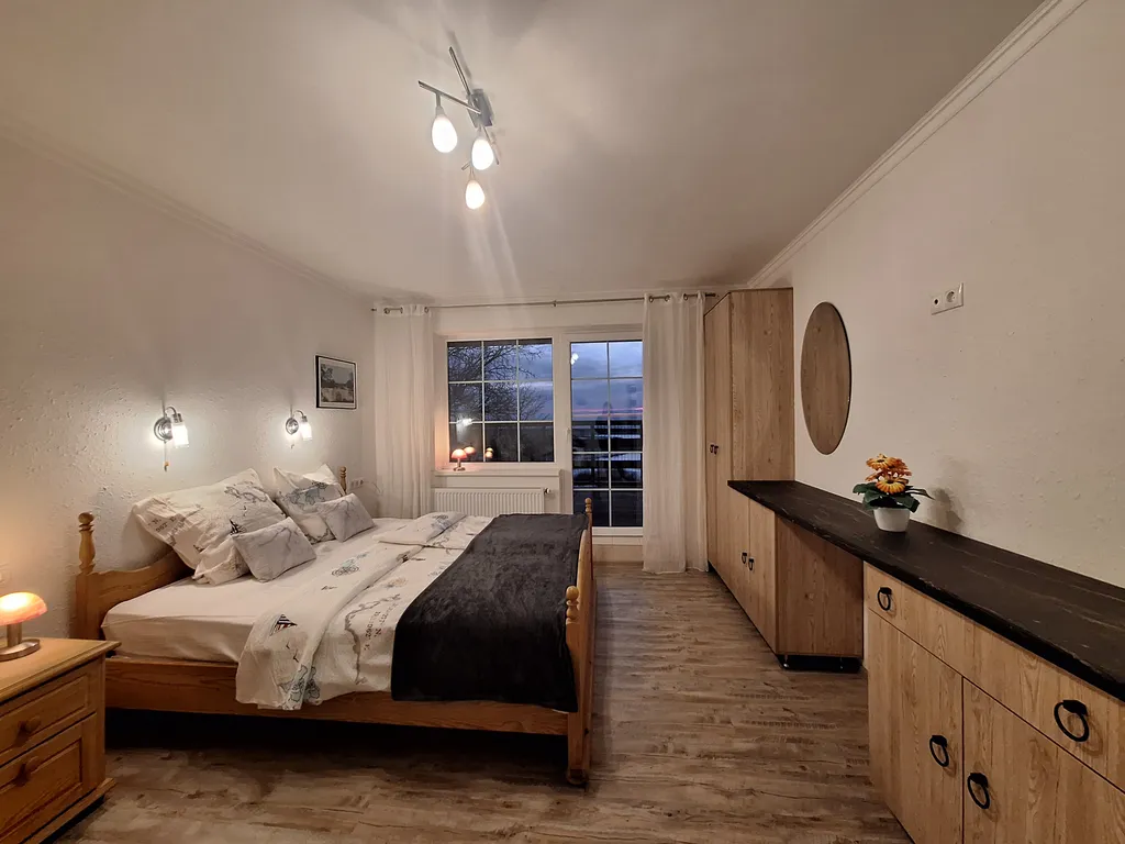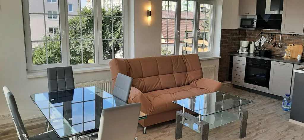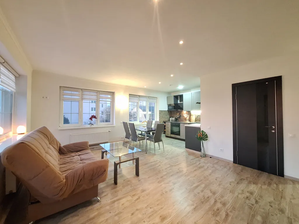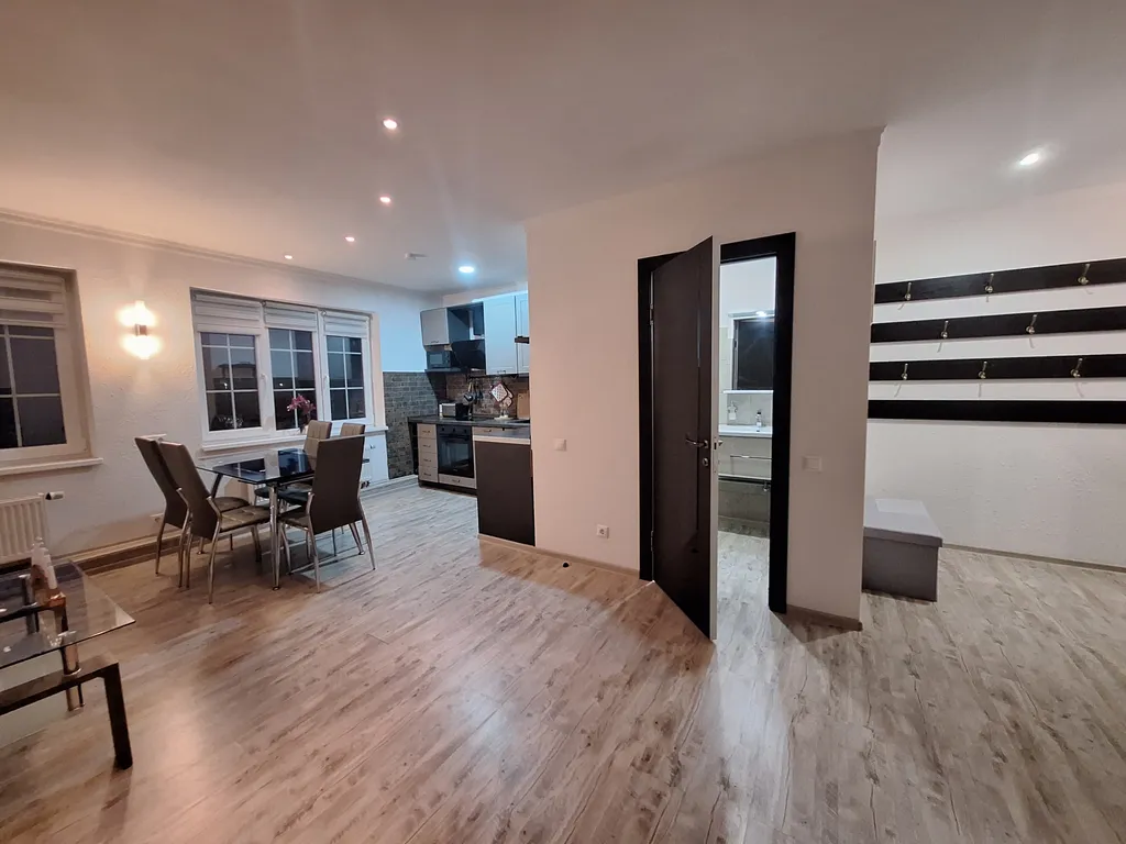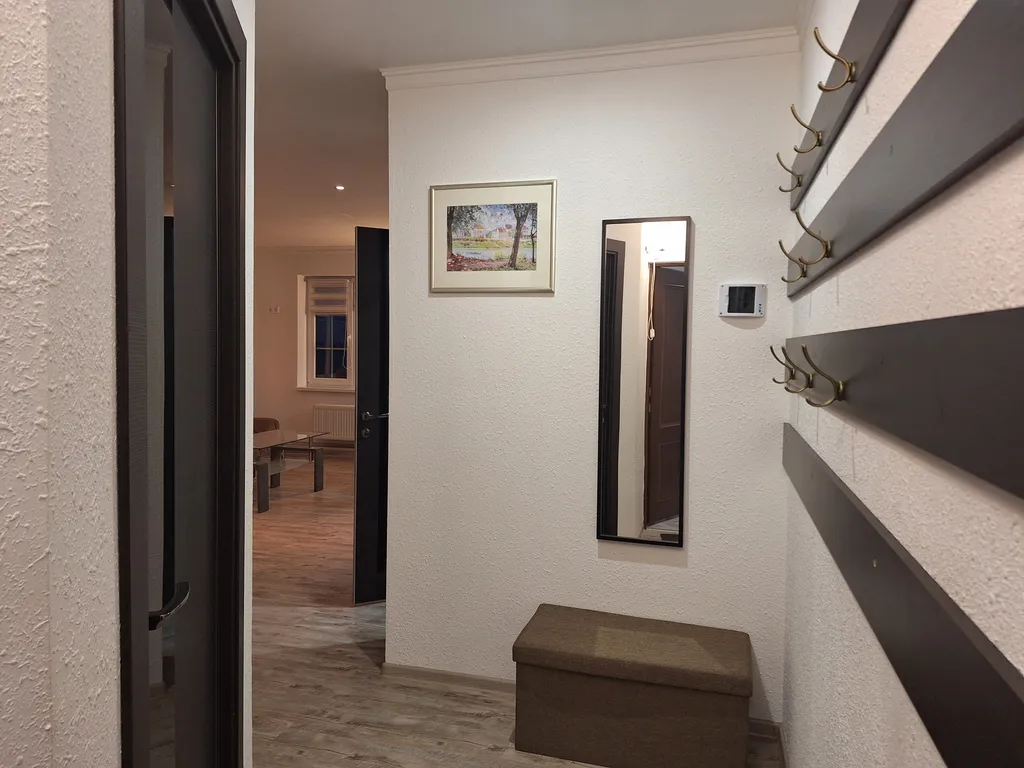 В зале также имеются удобный раскладной диван, большой обеденный раздвижной стол на 6 персон, 6 стульев, журнальный стол и телевизор.