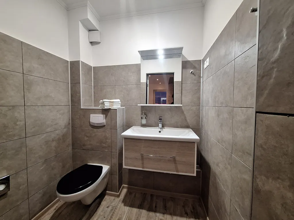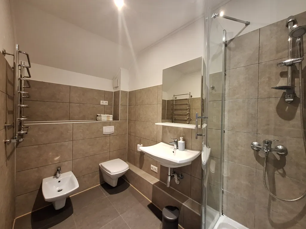 Апартаменты расположены на втором этаже дома и имеют 2 отдельных санузла: гостевой wc с раковиной на нижнем этаже и второй просторный санузел с биде, раковиной и душевой кабиной с видом на море на верхнем этаже.