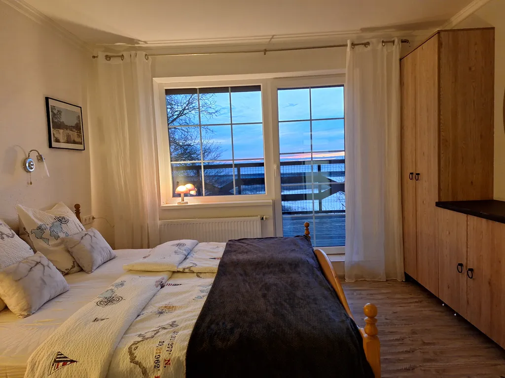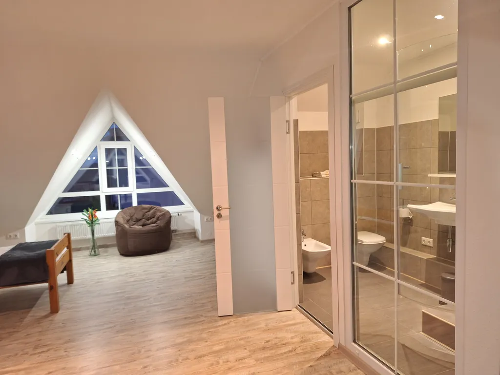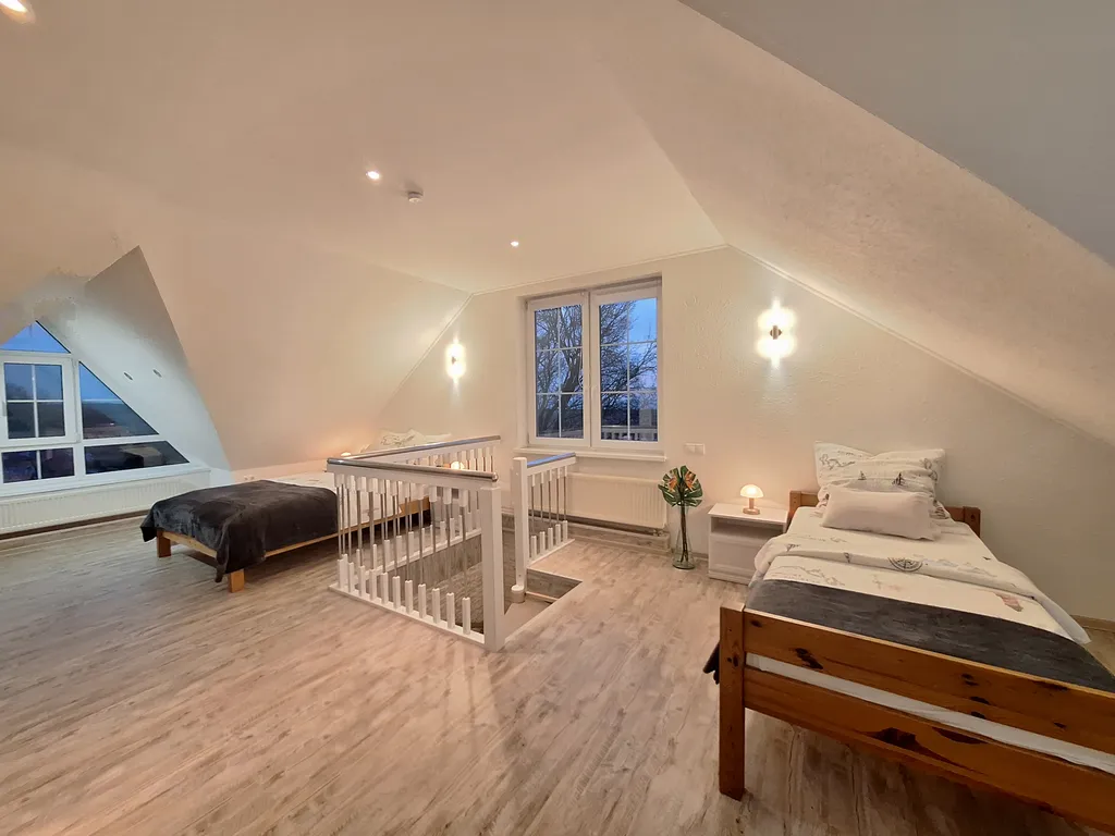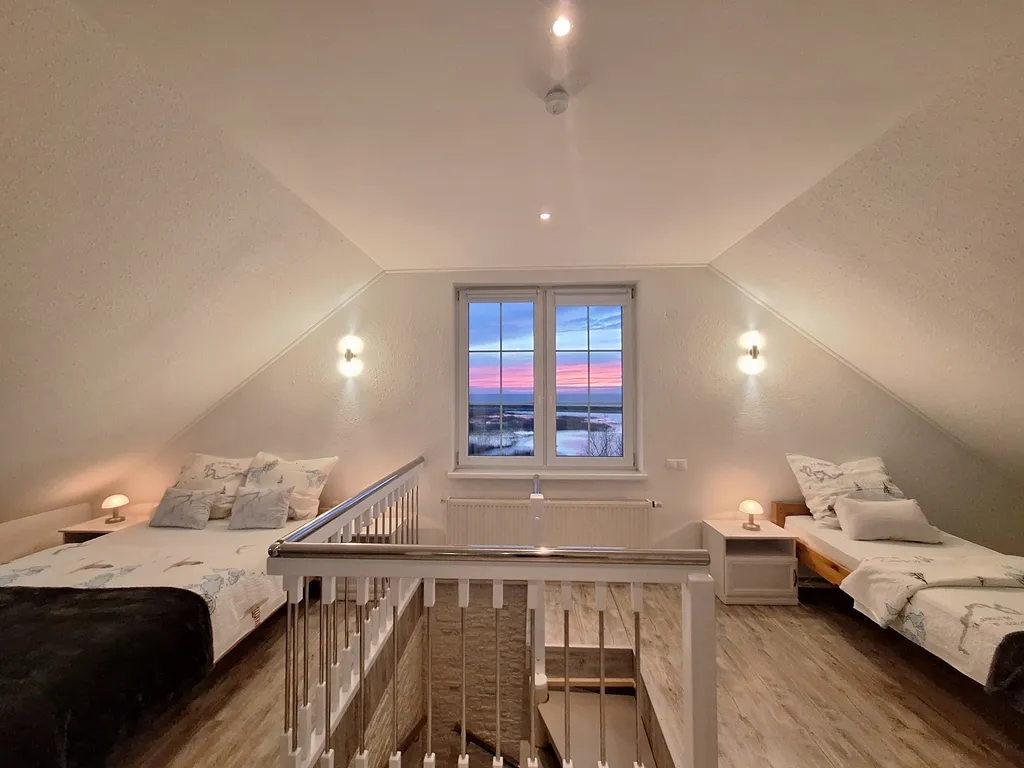 Винтовая лестница ведет на просторный мансардный этаж, где имеются второй санузел с душевой кабиной с видом на море-), раковиной, wc и биде, а также две односпальные и одна двуспальная (140 х 200) кровати, небольшой столик с двумя креслами, где с чашечкой кофе можно наблюдать потрясающий закат солнца!