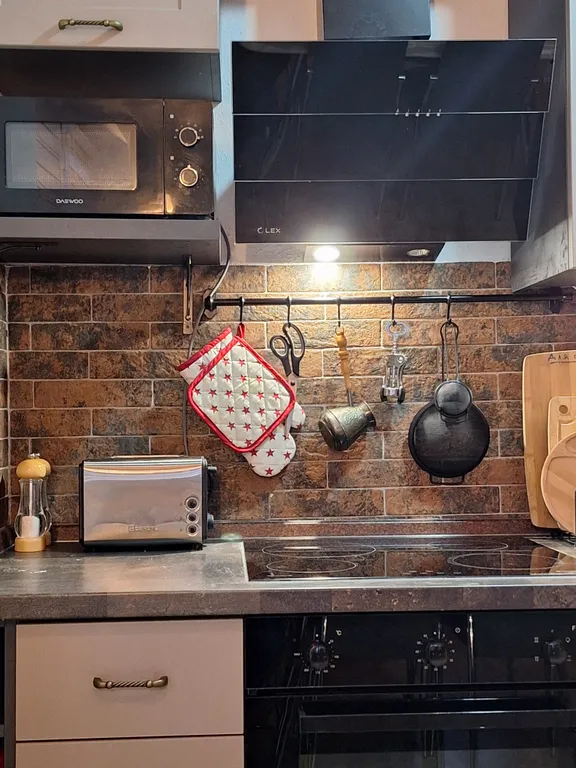 Холодильник, электроплита с духовым шкафом, микроволновая печь, кофеварка, турка, посудомоечная машина, вытяжка, кофемашина, тостер, электрический чайник, сковородки, кастрюли и другая посуда, кухонные полотенца.
