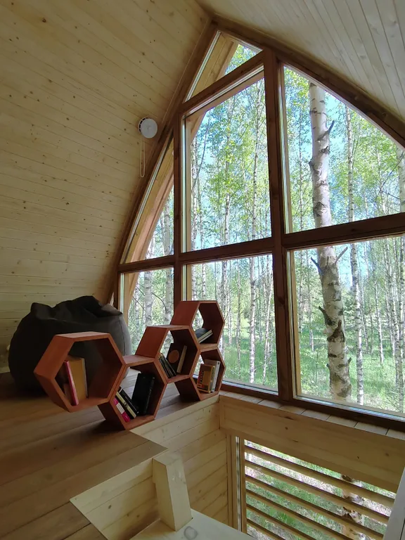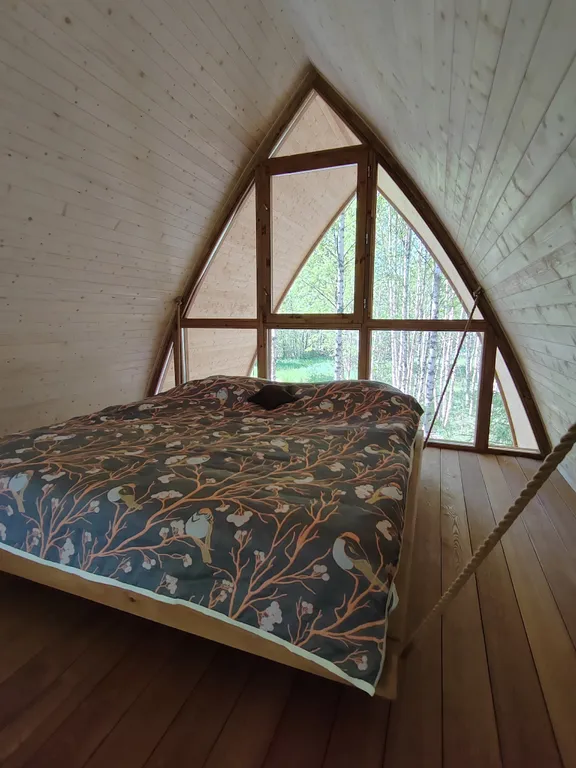 2 спальни: 2 двуспальные кровати, одна из них полностью подвесная с панорамным видом из окна на лес + диван