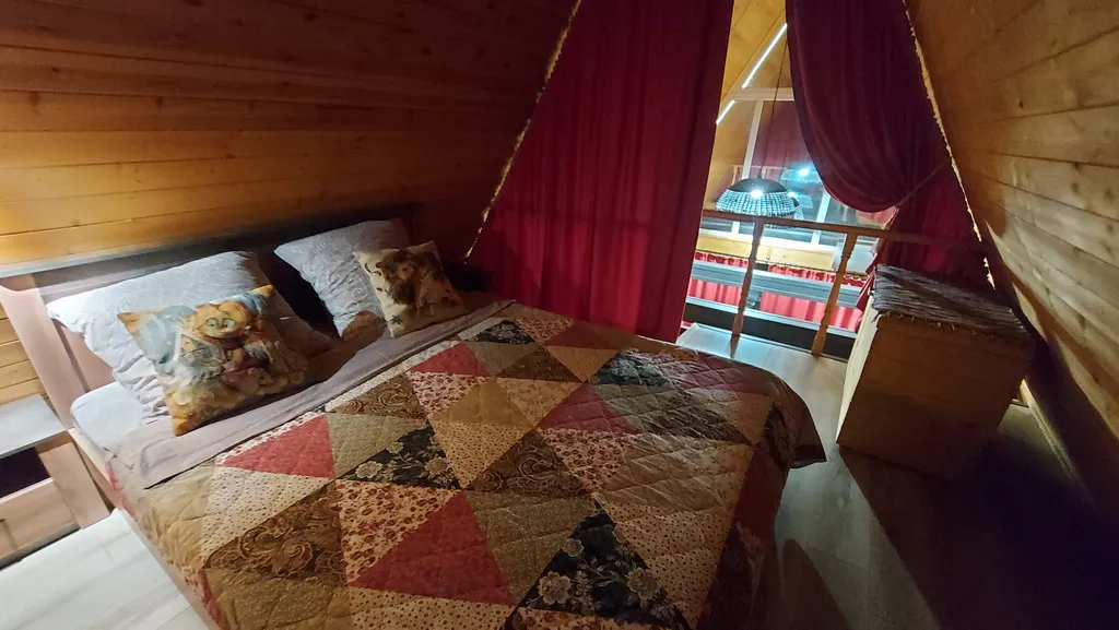 В домике 2 комнаты (1-я мансардная, 2-я изолированная на 1-м этаже: они с двуспальными кроватями), + кухня-гостиная с раздвижным диваном (200*150) на пружинном блоке.