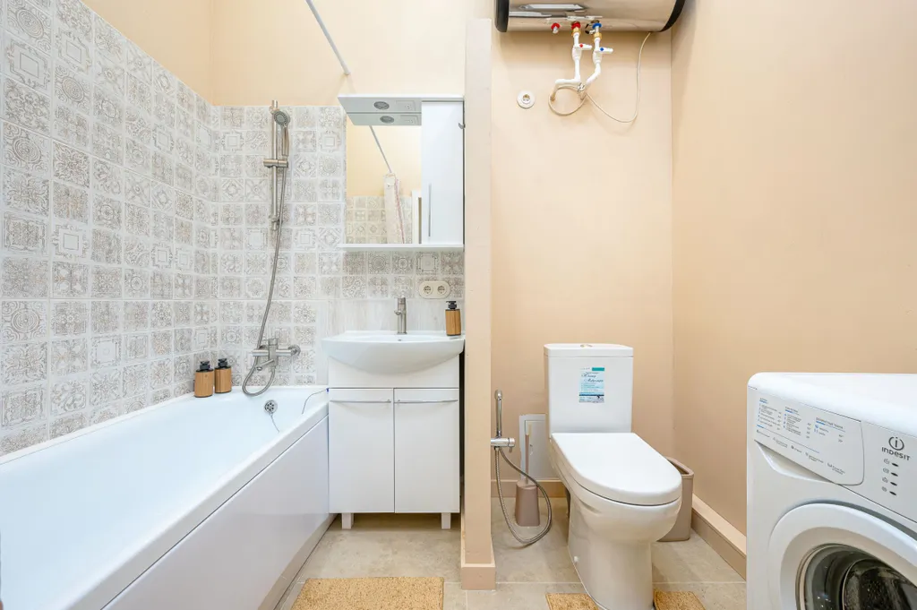 В просторной ванной комнате - ванная, туалет и раковина, стиральная машина.