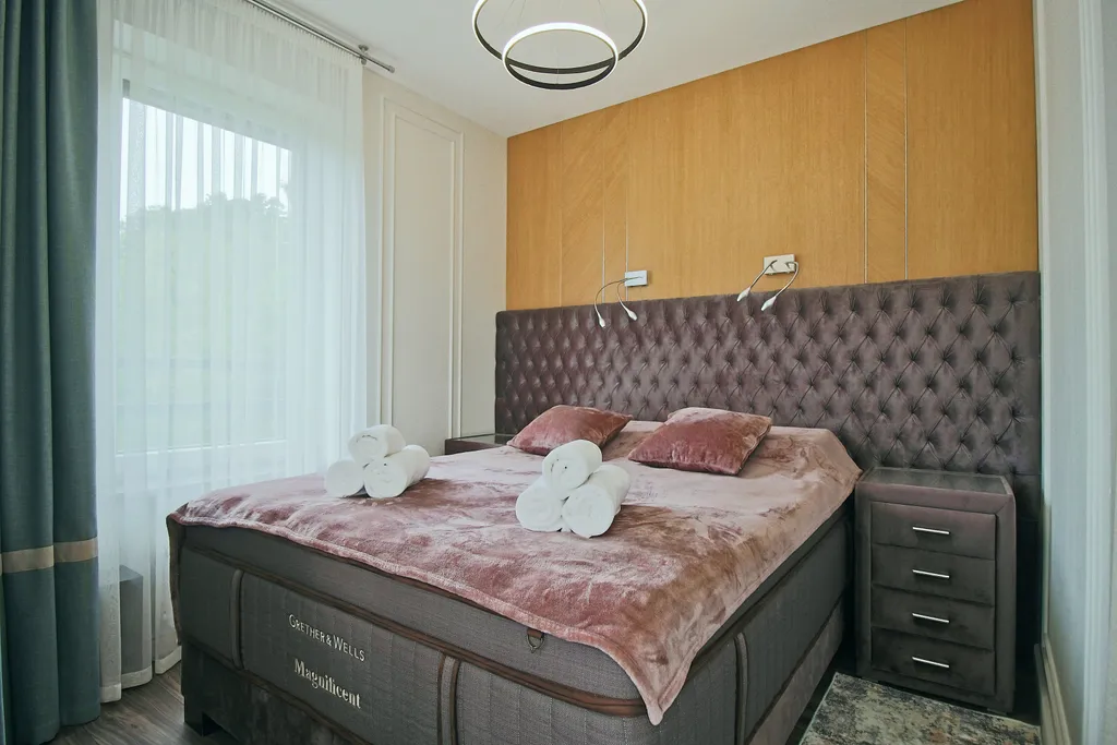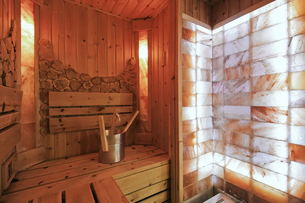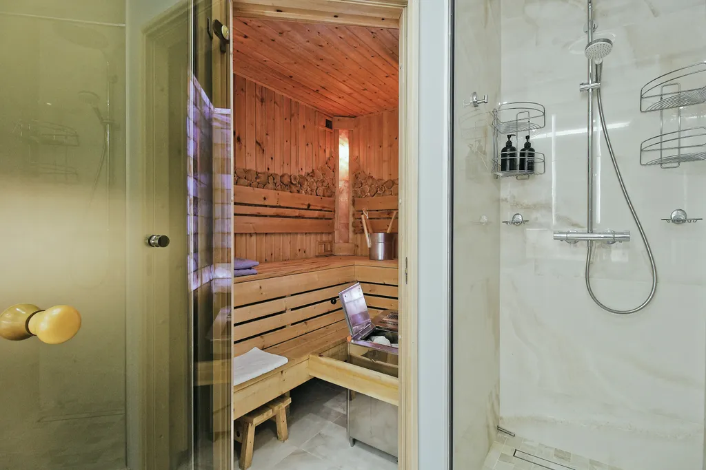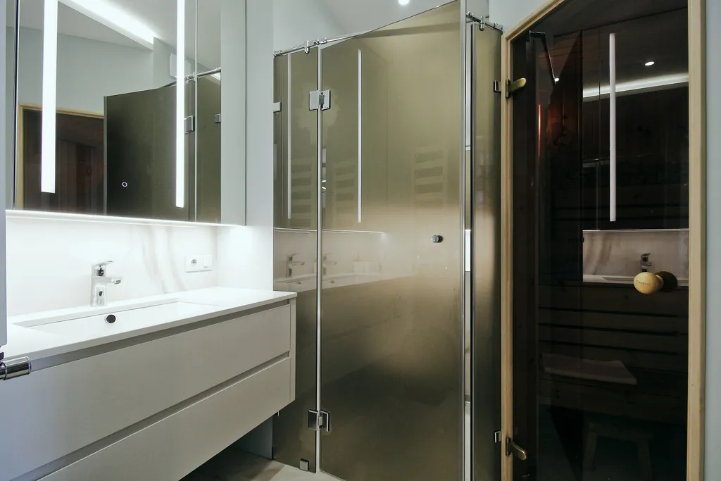 - Ванная комната с душем, туалетные принадлежности и мягкие полотенца для каждого гостя. Также в апартаментах расположена сауна с солевыми панелями, что поможет вам расслабиться и насладится отдыхом!