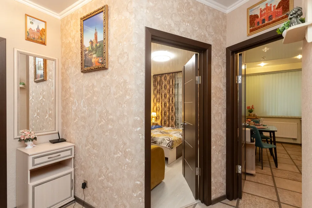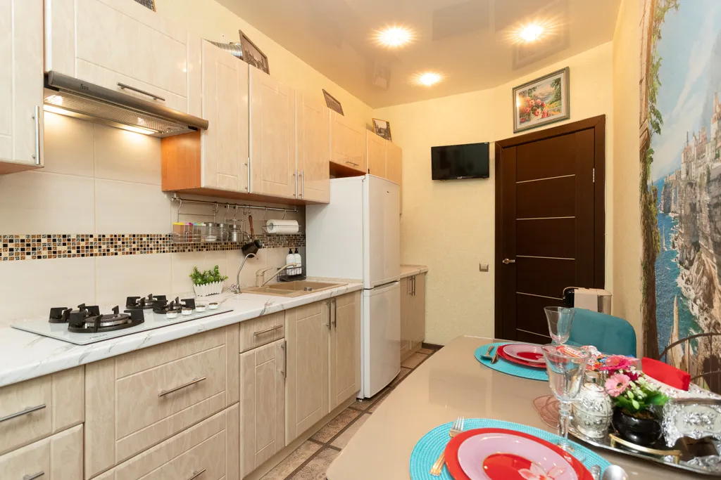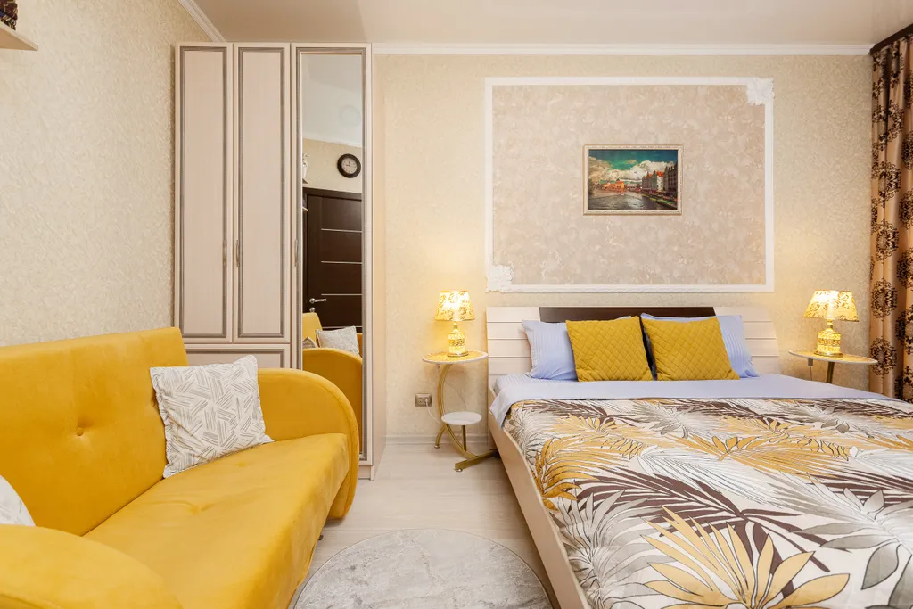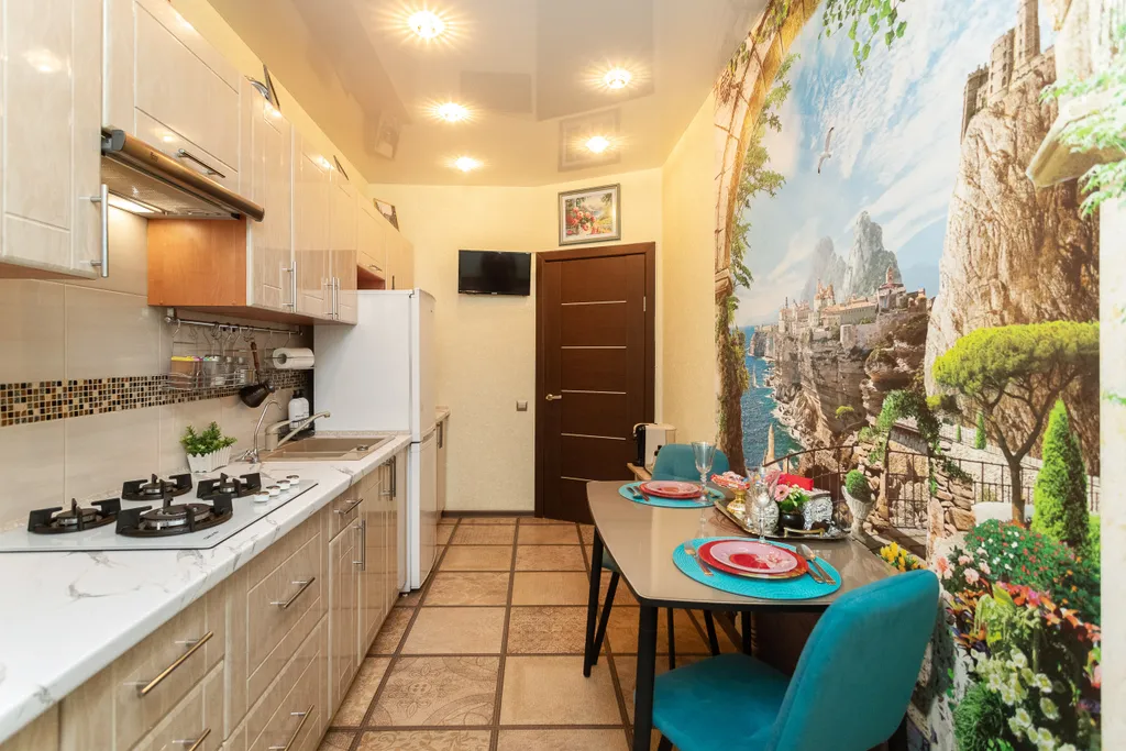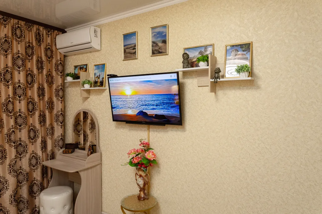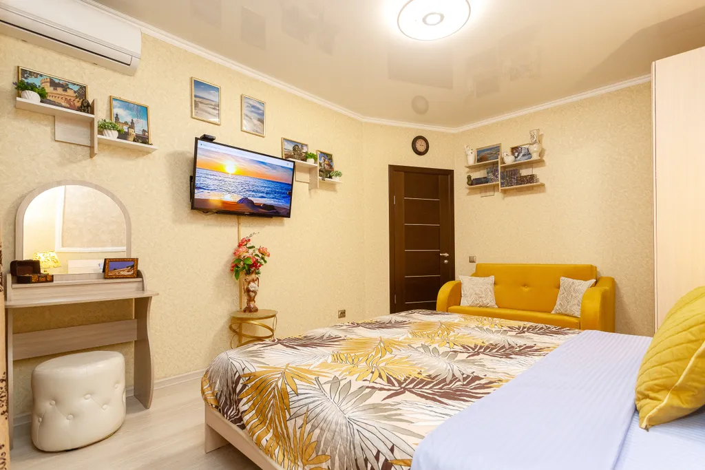 Апартаменты оснащены всем необходимым для комфортного проживания. Новая мебель, огромная 2-спальная кровать с ортопедическим матрасом, раскладной 1,5-спальный диван, шкаф, туалетный столик, журнальный и много приятных мелочей. Кондиционер. Кухня оснащена посудомоечной машиной, духовкой, микроволновой печью, кофемашиной, тостером, множеством бытовой техники, новая посуда, кофе-чайные принадлежности. В апартаментах предоставляется постельные принадлежности, 3 комплекта полотенец, всевозможные гигиенические средства, тапочки, халаты. Туалетная комната оснащена ванной с тропическим душем, стиральной машиной.