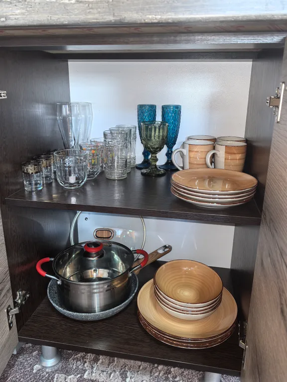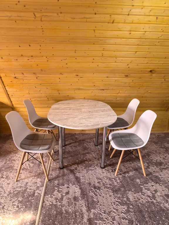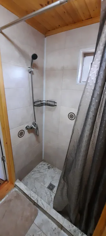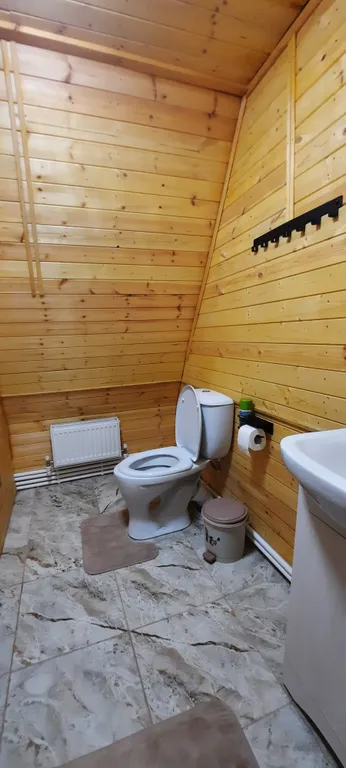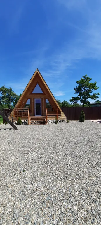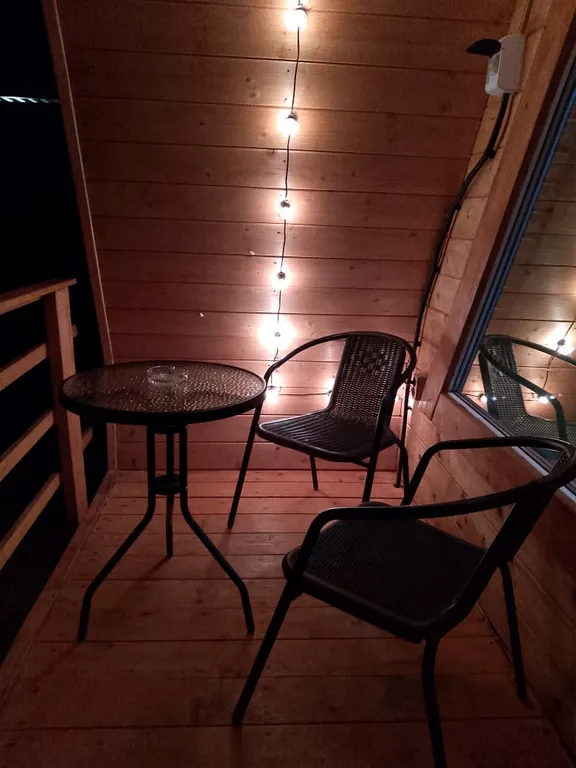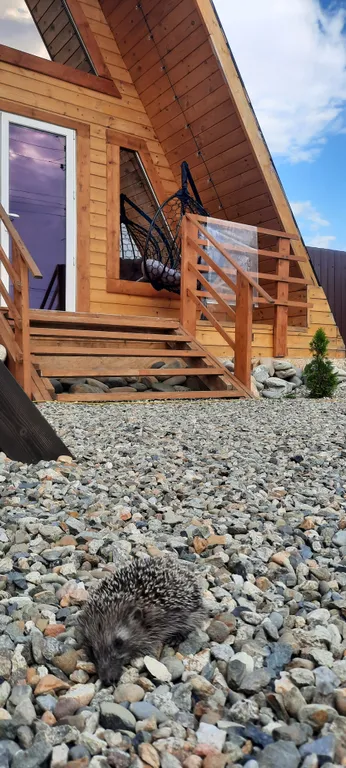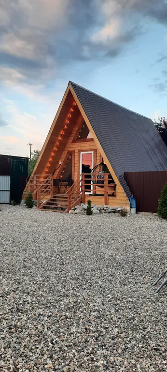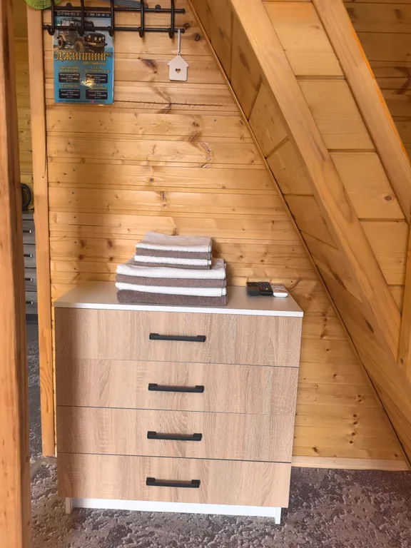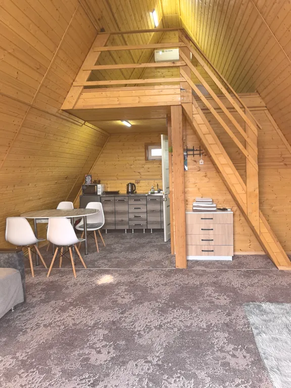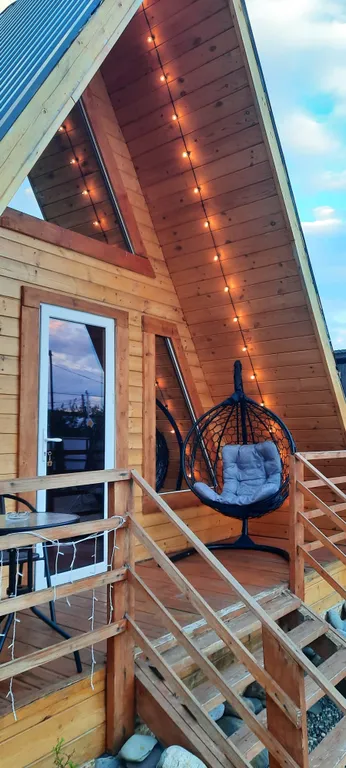 Внутри домика – все для комфортной жизни: современная кухня, полный комплект посуды на 6 персон, плита, холодильник, чайник, микроволновка. Санузел с душем, фен и мягкие полотенца. Гостиная с двумя диванами, комодом и телевизором. На втором этаже – просторный двуспальный матрас и спасительная прохлада сплит-системы.