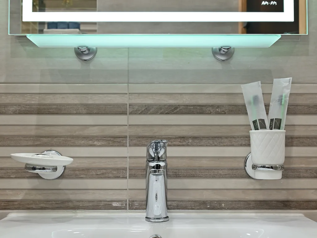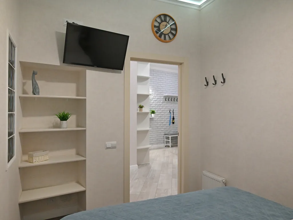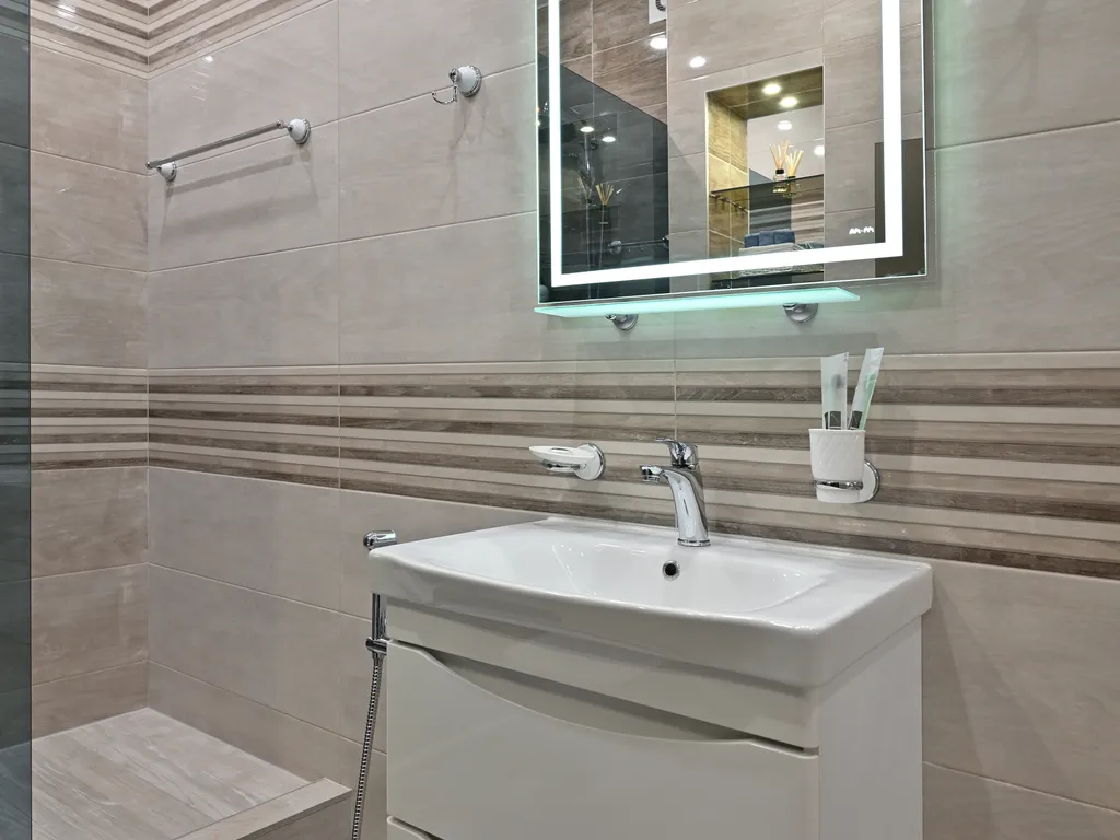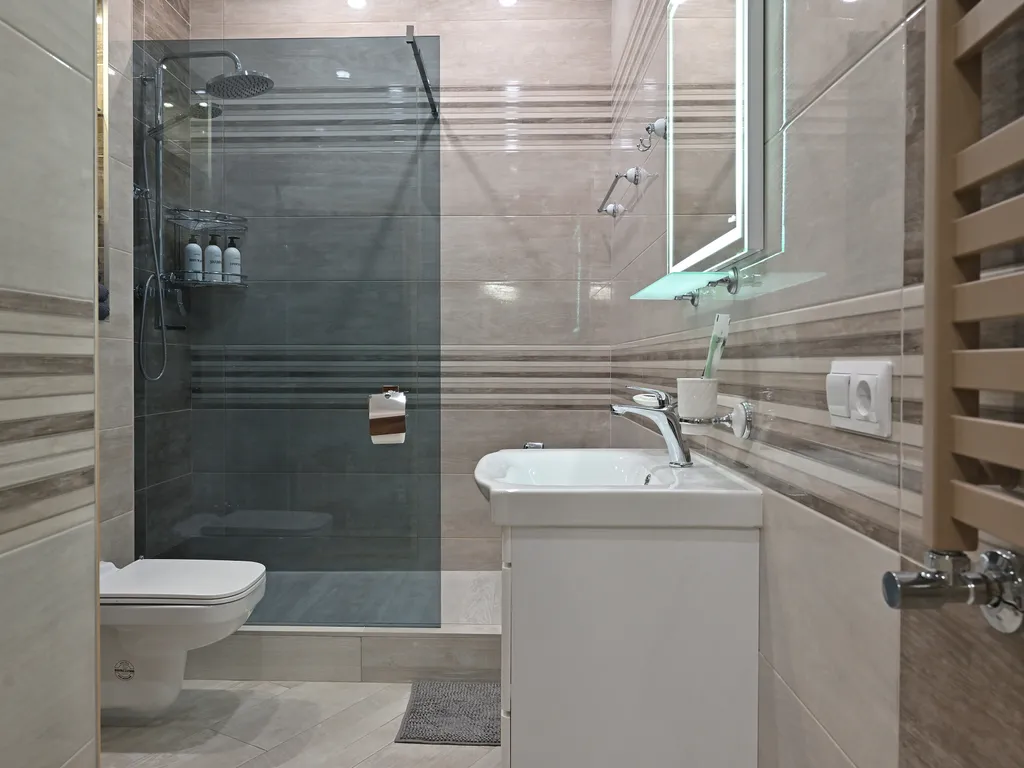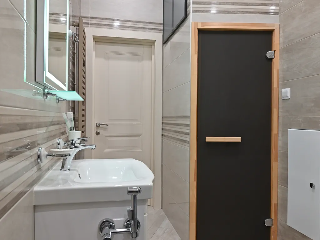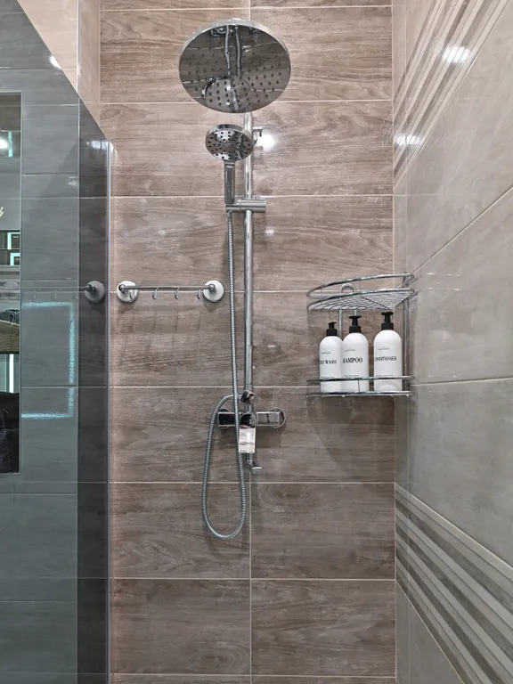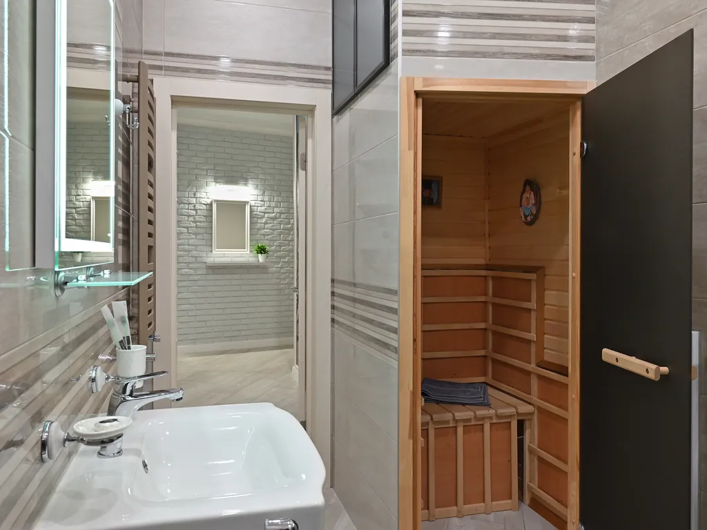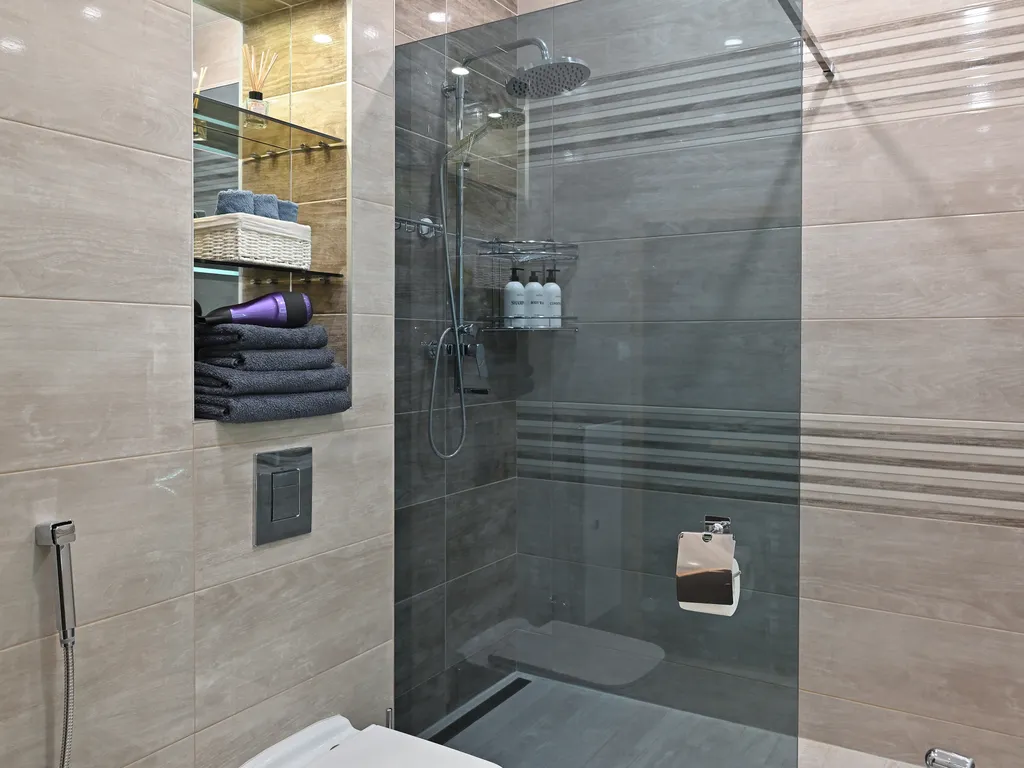 - Просторный санузел с душевой и гигиеническими средствами, необходимое постельное бельё, по 3 полотенца на гостя, вместительный шкаф, фен, утюг, гладильная доска и не только)