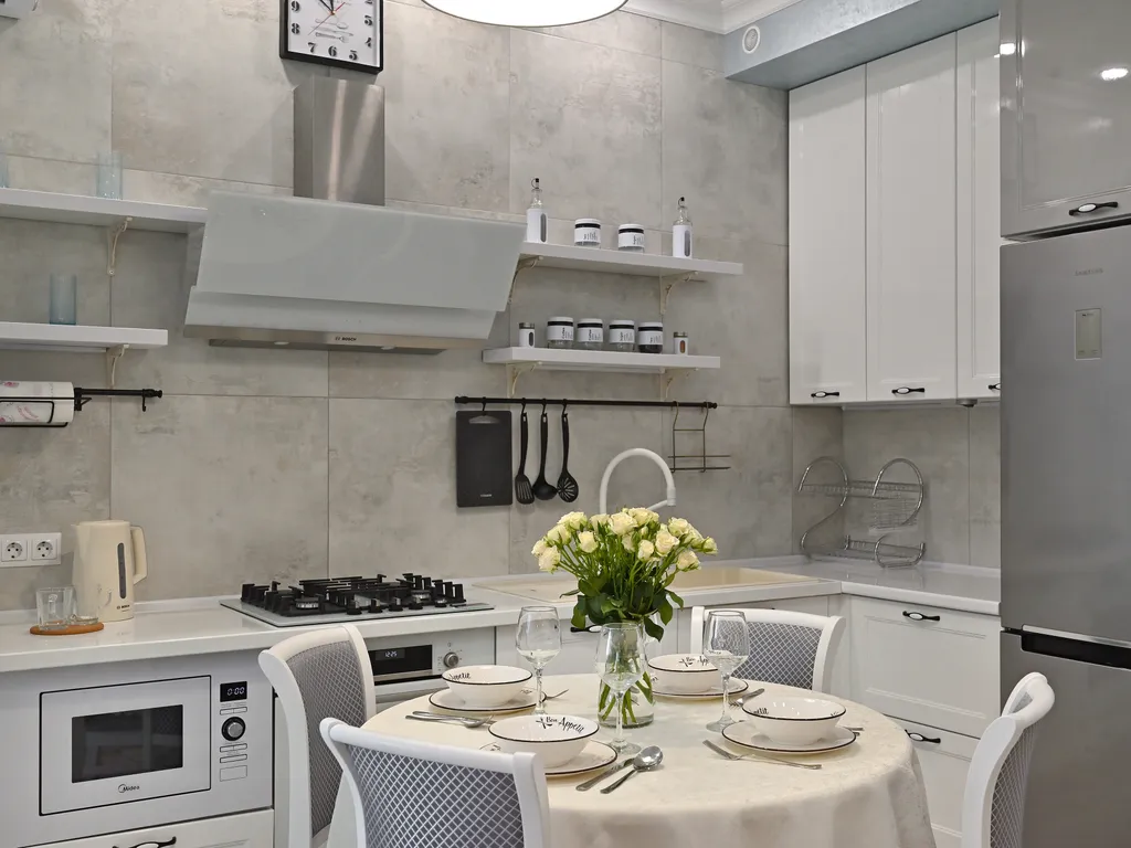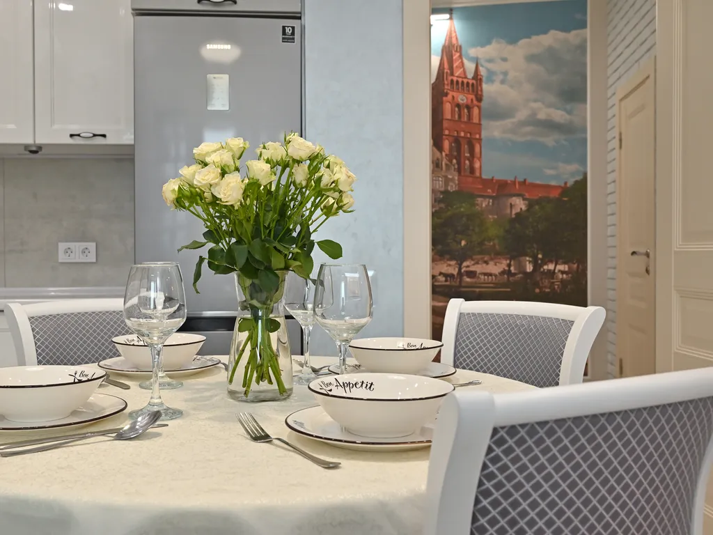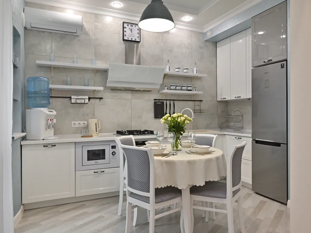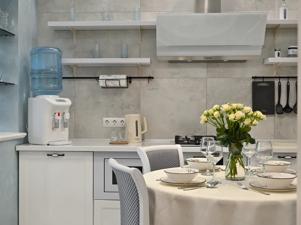 - Укомплектованная кухня для полного цикла приготовления еды (плита, микроволновая печь, холодильник, электрический чайник, духовой шкаф, большой обеденный стол, полный набор посуды и кухонных принадлежностей)