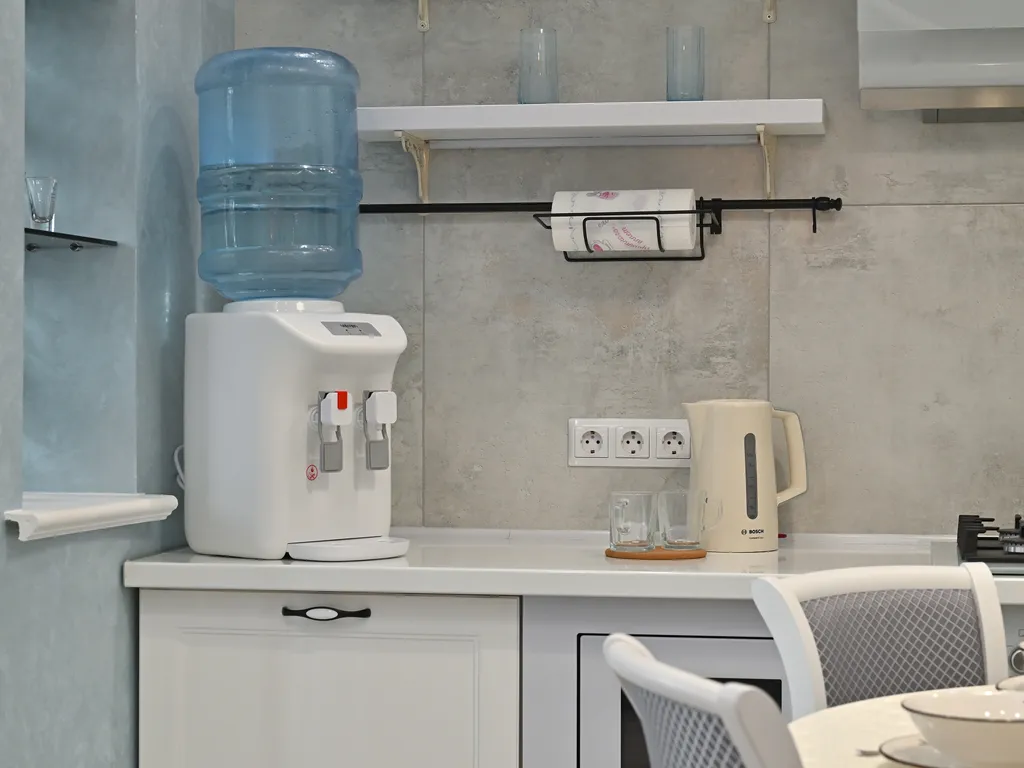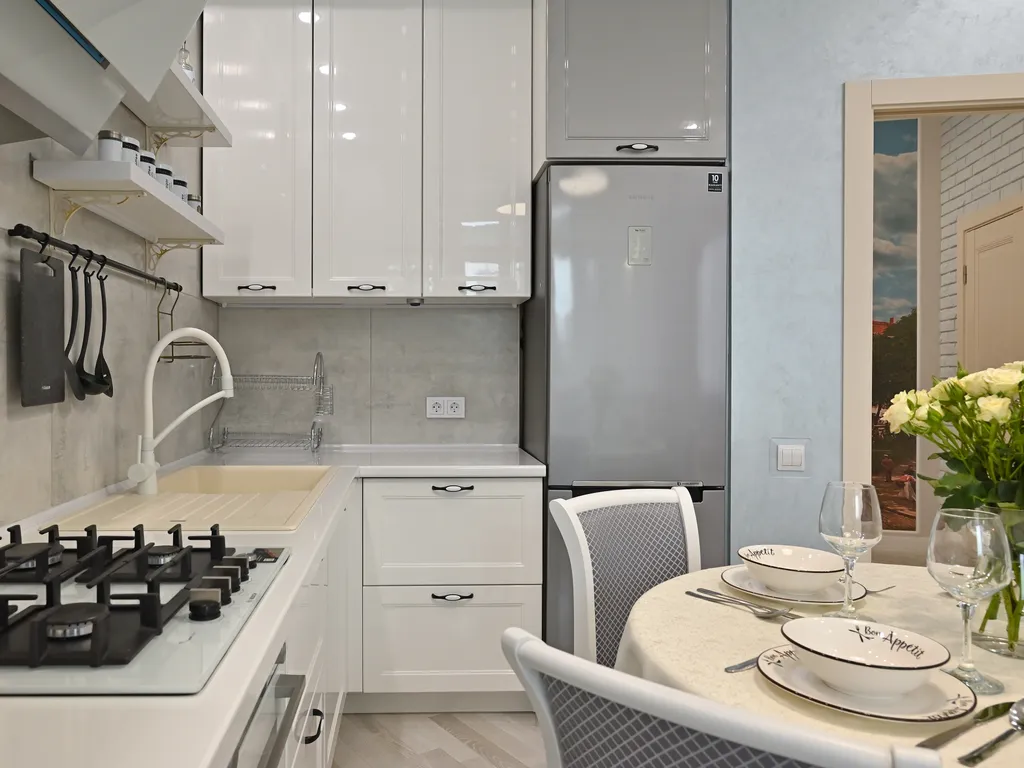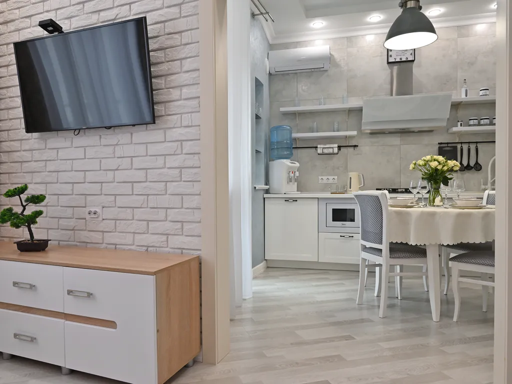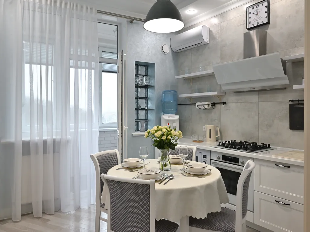 - Укомплектованная кухня для полного цикла приготовления еды (плита, микроволновая печь, холодильник, электрический чайник, духовой шкаф, большой обеденный стол, полный набор посуды и кухонных принадлежностей)