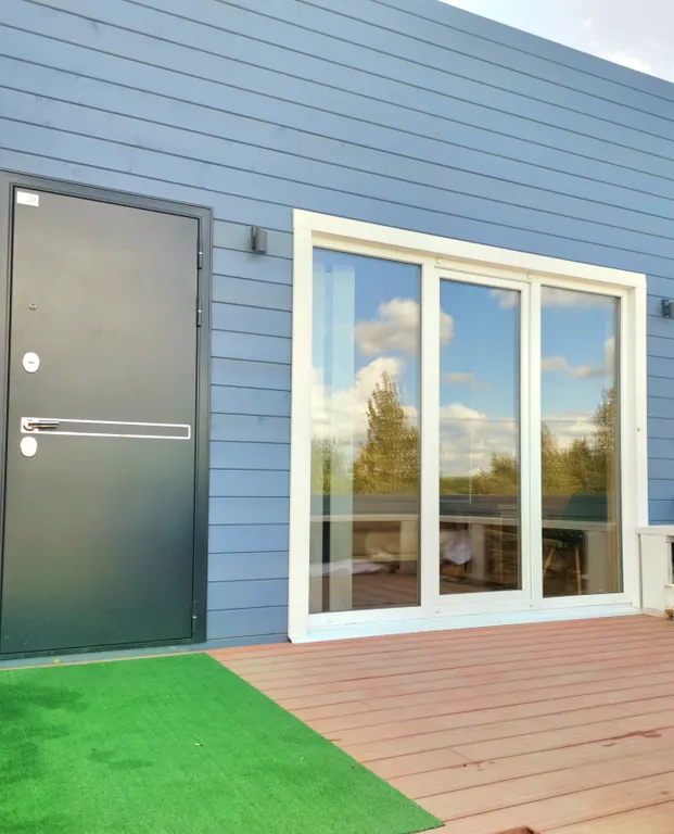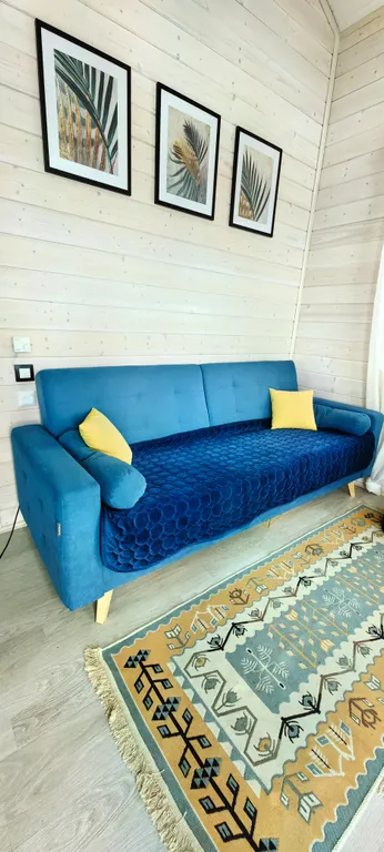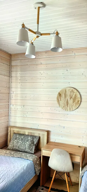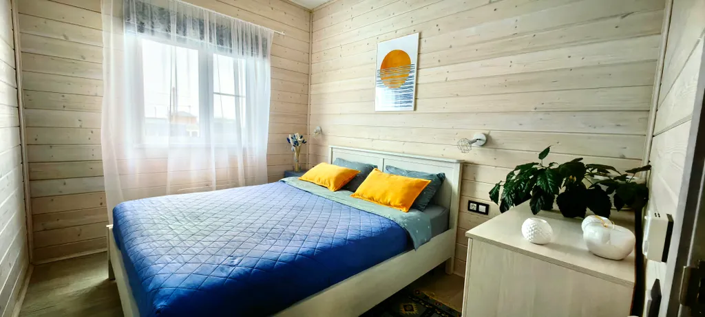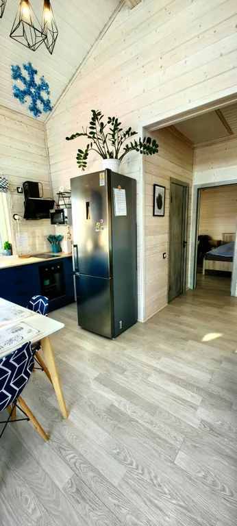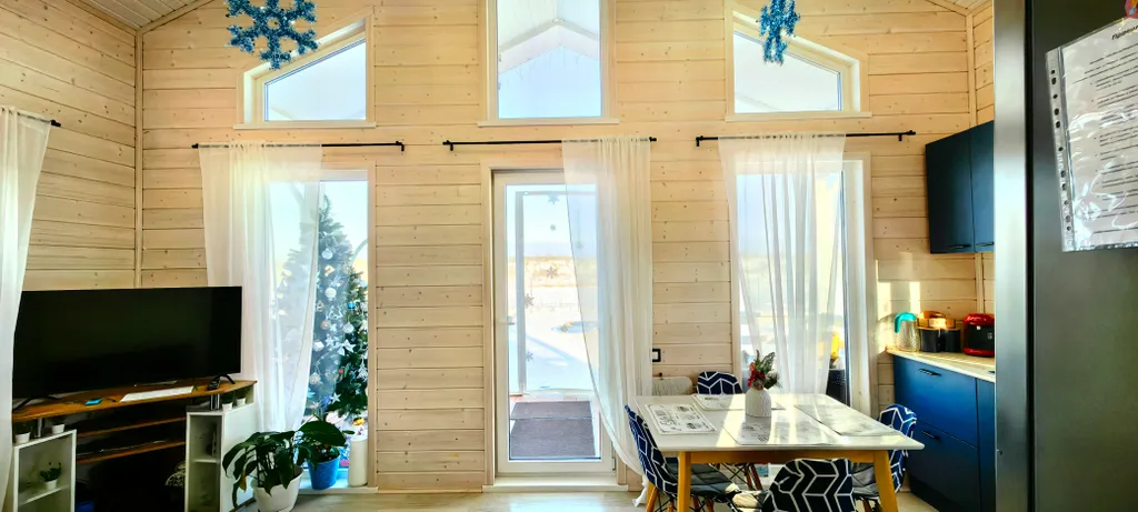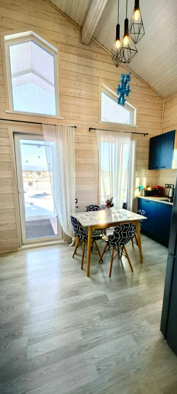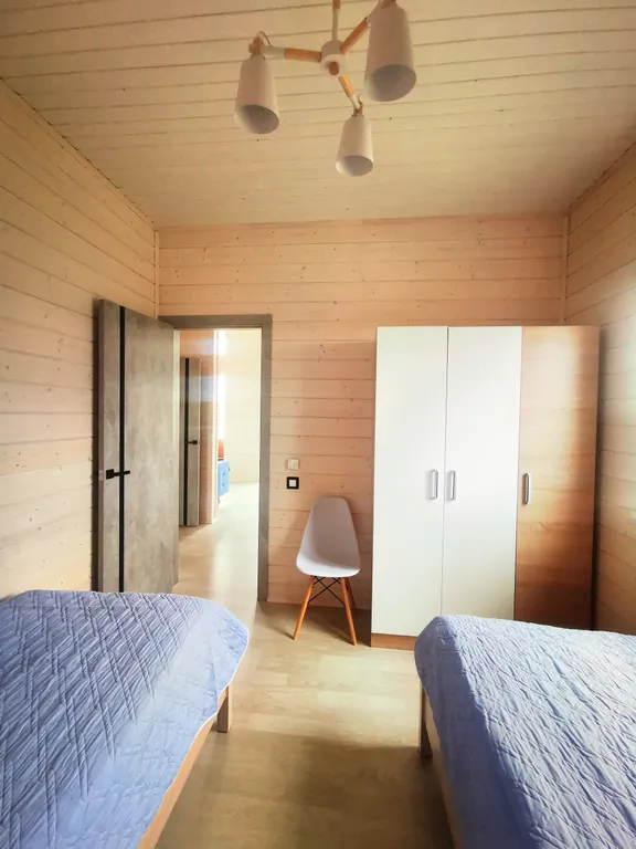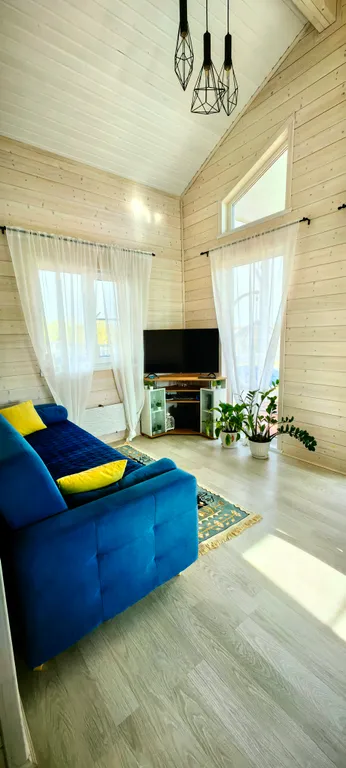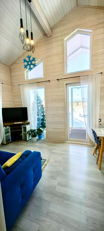 Дом состоит из 2-х отдельных спален, уютной кухни-гостиной с панорамными окнами и высоким 6-ти метровым потолком, холл, прихожая с гардеробной, санузел с душевой кабиной. Спальни оборудованы системами хранения, в одной из комнат есть письменный стол. В доме комфортно может разместиться до 6-ти человек. В каждой комнате телевизор.