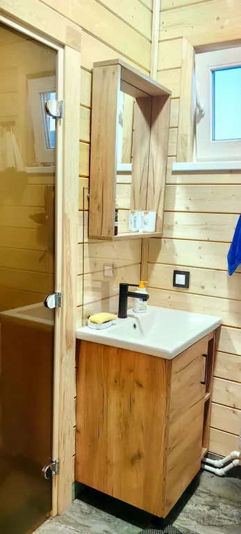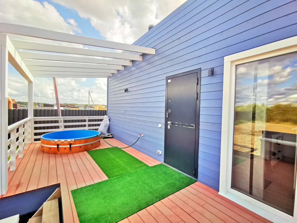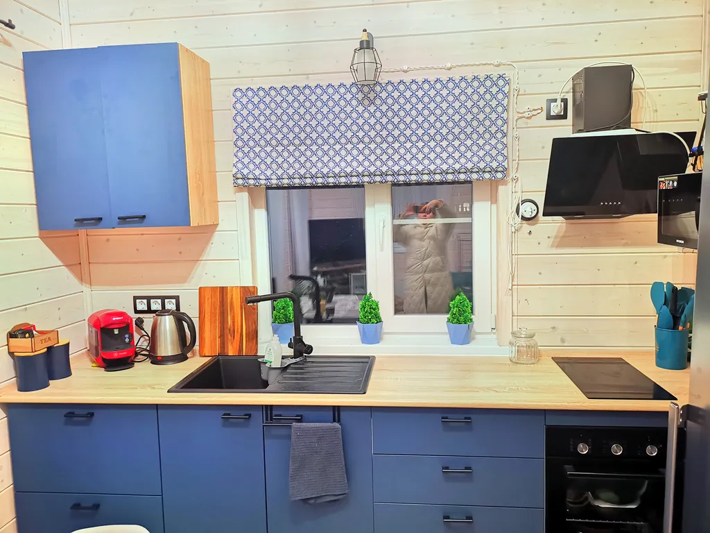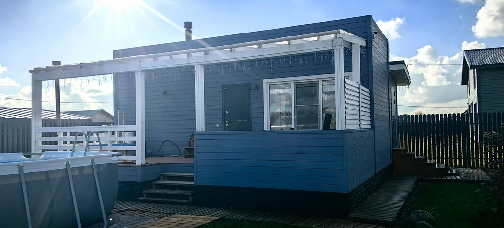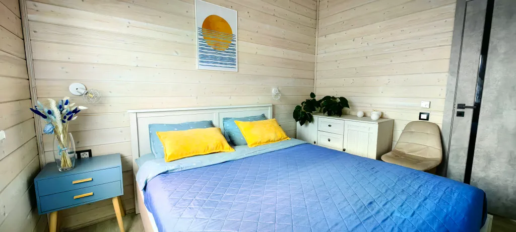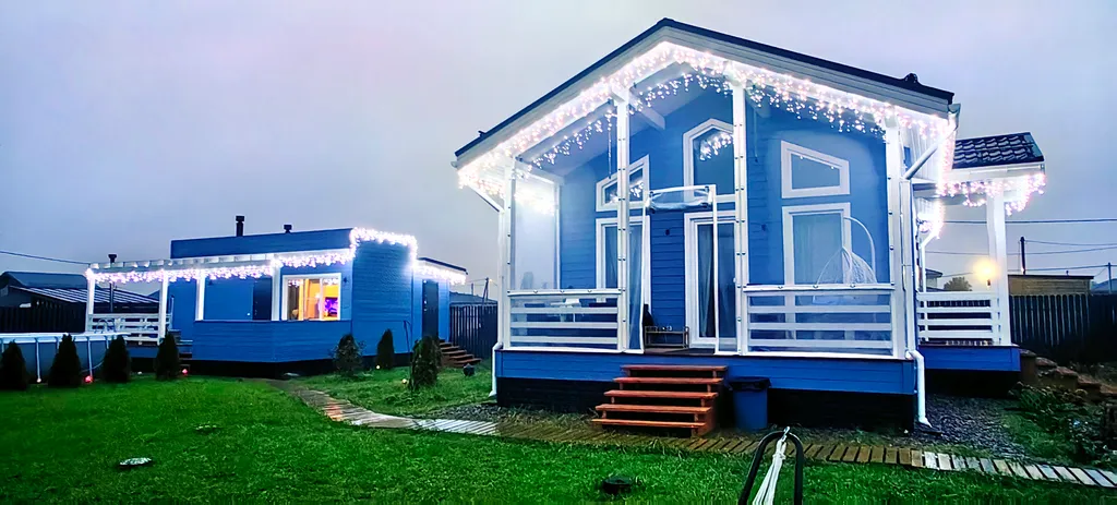 Дом состоит из 2-х отдельных спален, уютной кухни-гостиной с панорамными окнами и высоким 6-ти метровым потолком, холл, прихожая с гардеробной, санузел с душевой кабиной. Спальни оборудованы системами хранения, в одной из комнат есть письменный стол. В доме комфортно может разместиться до 6-ти человек. В каждой комнате телевизор.