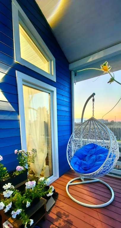 Открытая терраса с диваном, столиком, креслами. Качели-кокон.