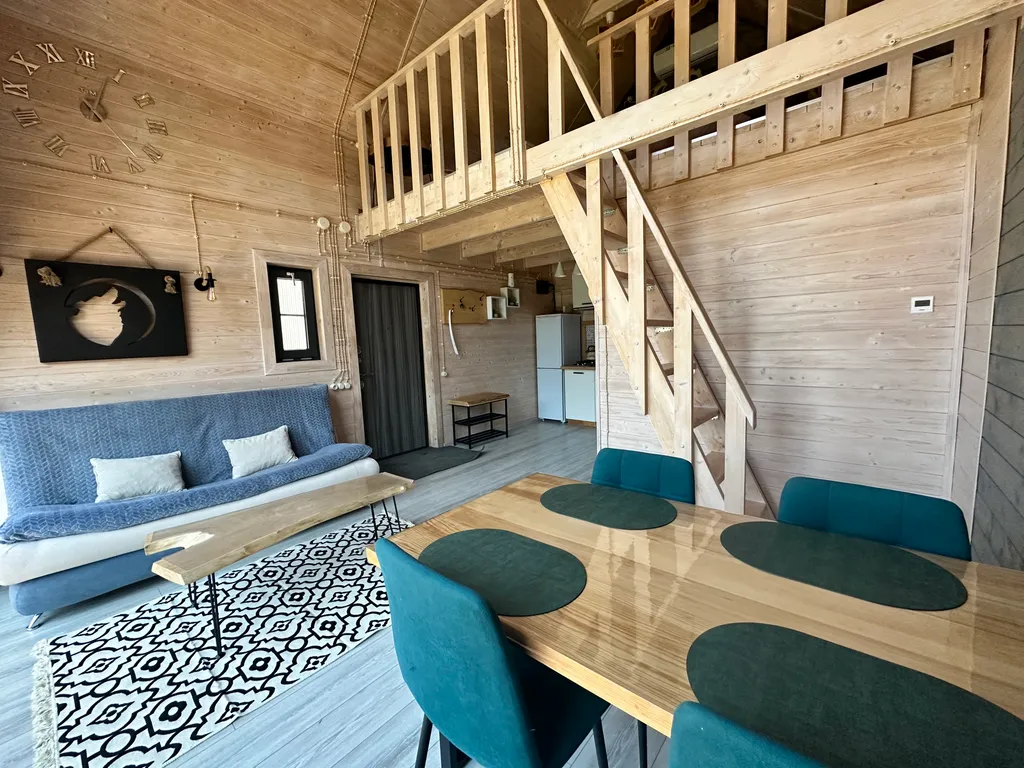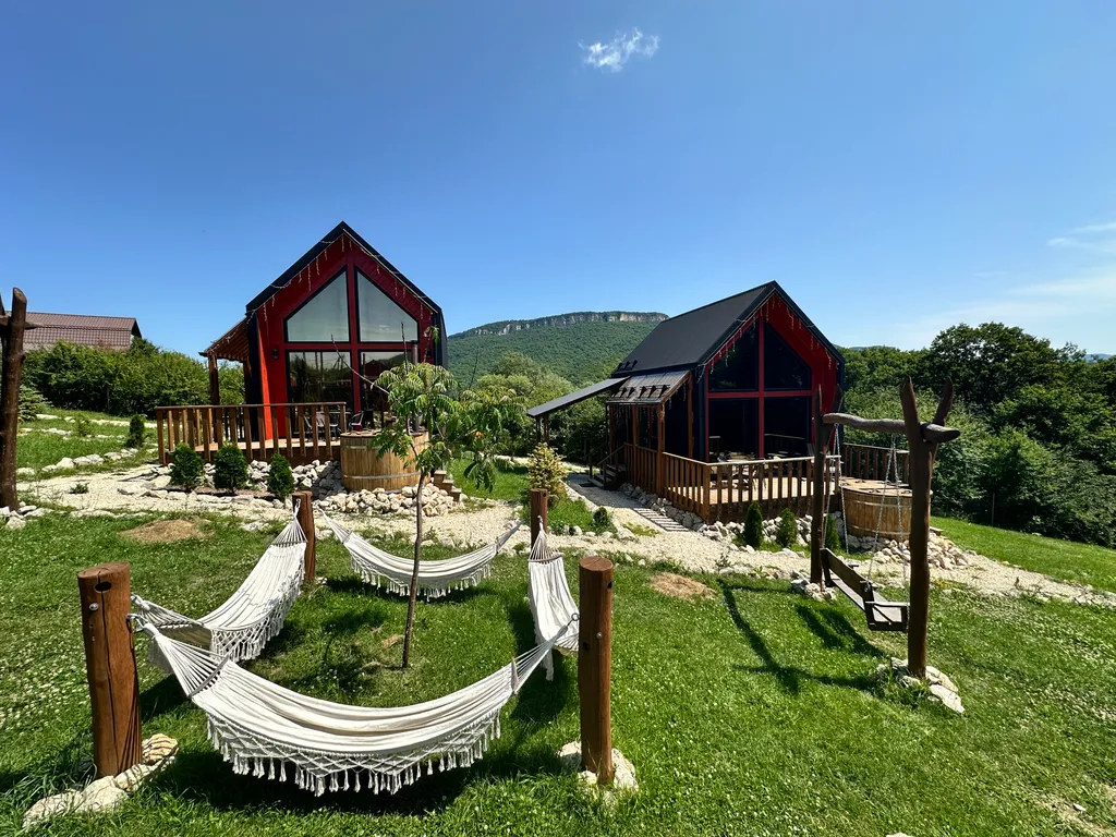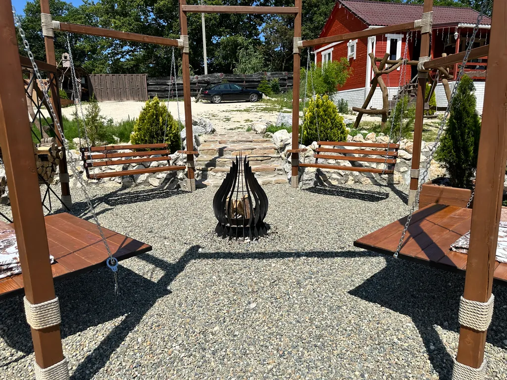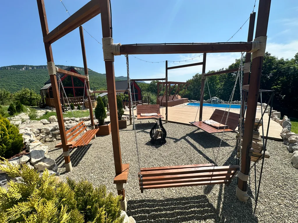 Территория оборудована общим подогреваемым бассейном (8,2 х 3,7), костровой зоной, качелями, гамаками и парковкой (входит в стоимость проживания).