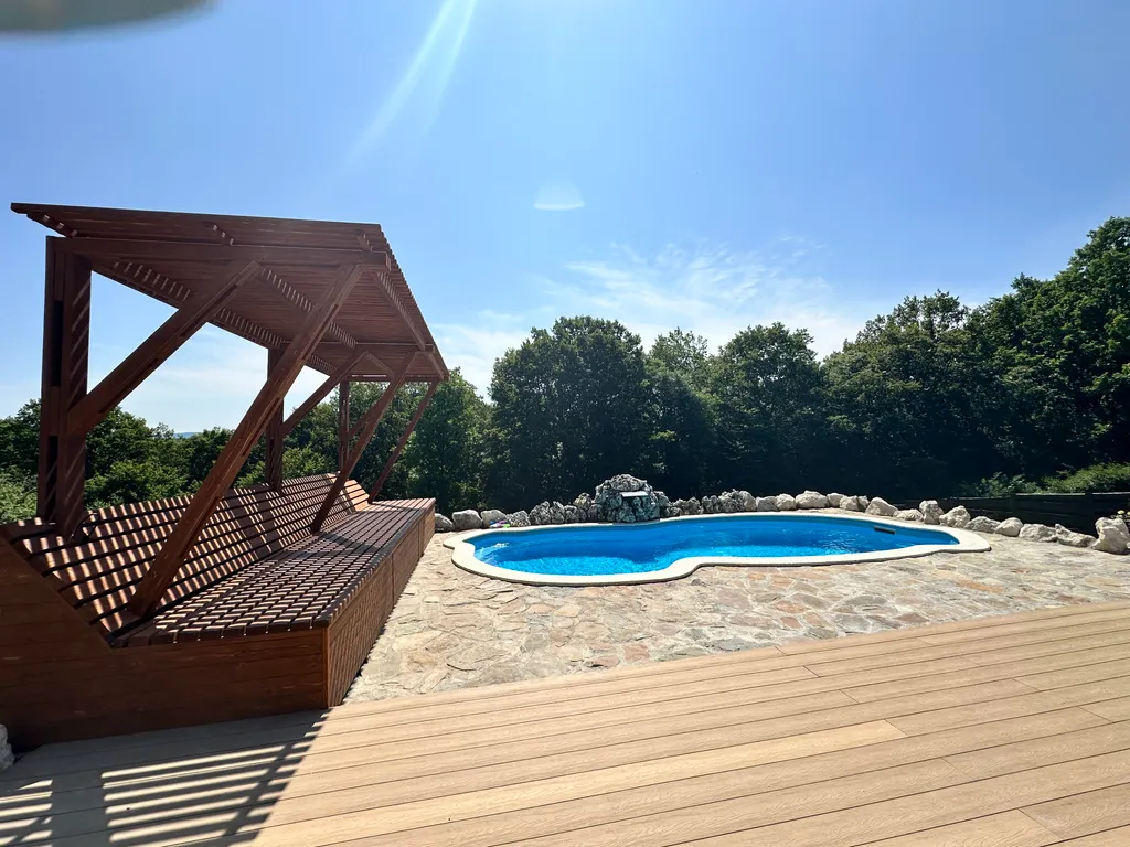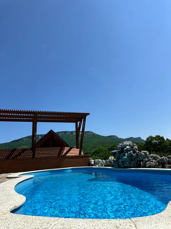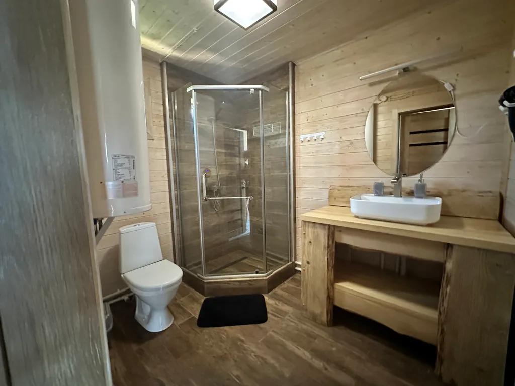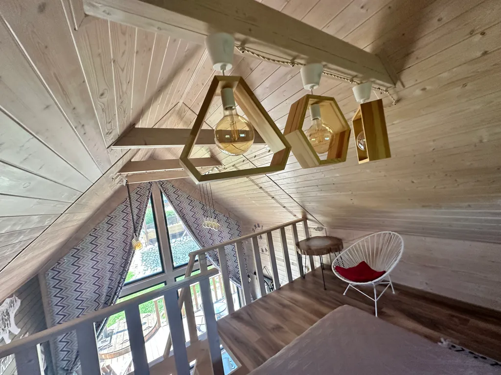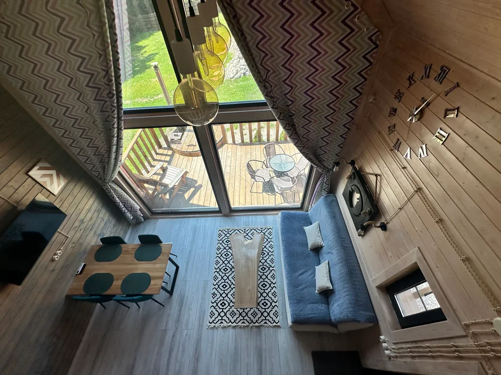 Территория оборудована общим подогреваемым бассейном (8,2 х 3,7), костровой зоной, качелями, гамаками и парковкой (входит в стоимость проживания).