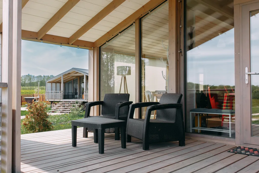 Терраса: 27 м2 со столом и лавками, кресла и столик.