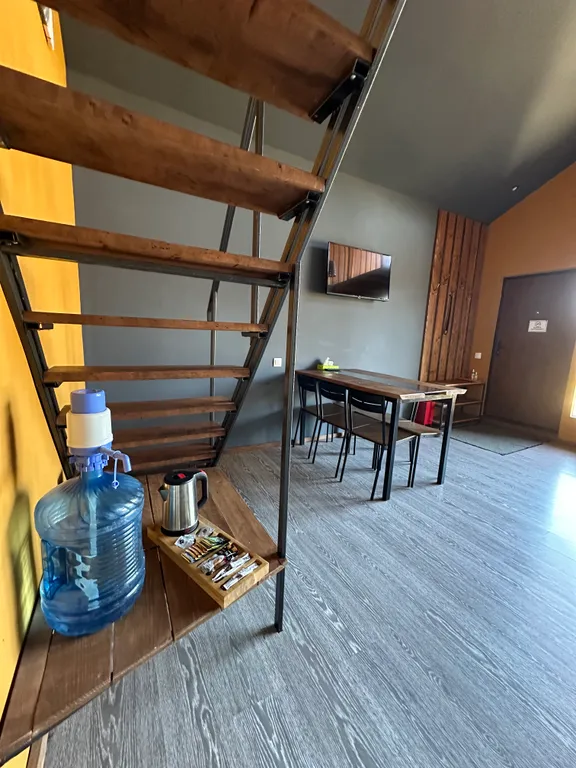 - полностью оборудованная кухня (холодильник, плита однокомфорочная электрическая, микроволновая печь, кулер, раковина, вся необходимая посуда для приготовления и сервировки)