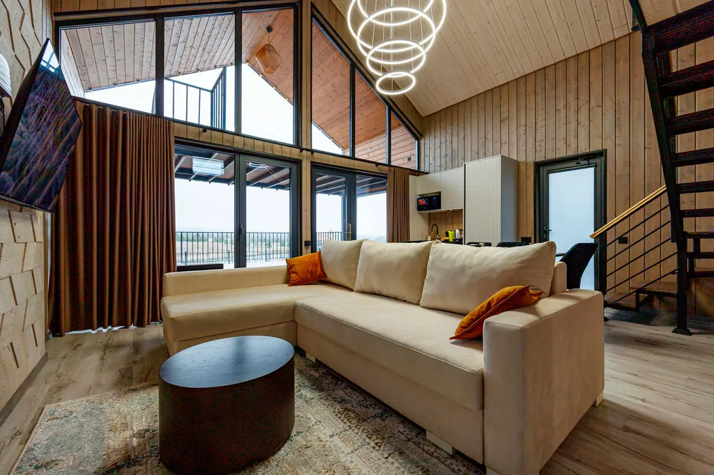Кухонная зона на первом этаже, обеденный стол, гостиная с раскладывающимся диваном, душевая на первом этаже, спальня на первом этаже, спальня на втором этаже, тёплые полы в холодное время года.