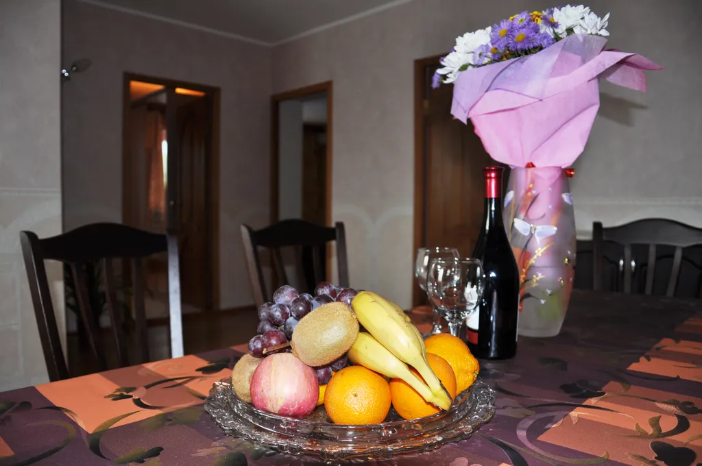 В просторном холле диван раскладной (1,8 х 2), обеденный стол, стулья, холодильник, микроволновая печь, чайник, посуда.