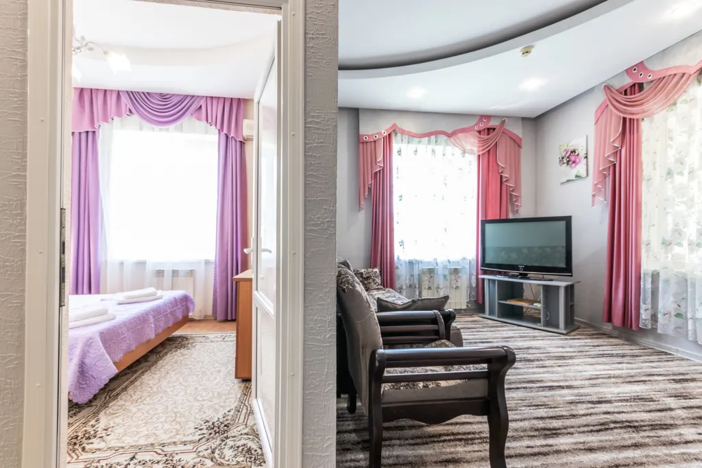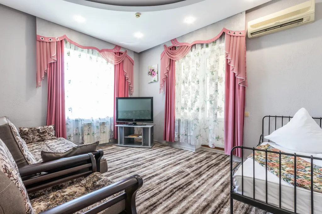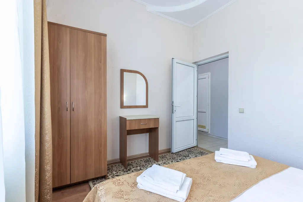 В номере: Две двуспальные кровати, диван двуспальный, односпальное кресло-кровать. Тумбочки, журнальный столик, два шкафа, зеркала, кондиционеры в каждой комнате, телевизор. Кухня, посуда, варочная поверхность, чайник, микроволновка, холодильник, стиральная машина, стол. Раздельный душ и туалет, полотенца все кроме пляжных, постельное белье, фен. Персональный балкон.