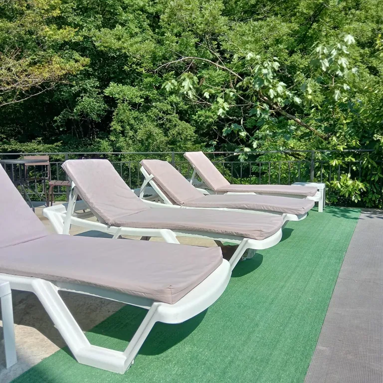 бассейн с шезлонгами с видом на море и горы, 28–35 градусов в летний период;