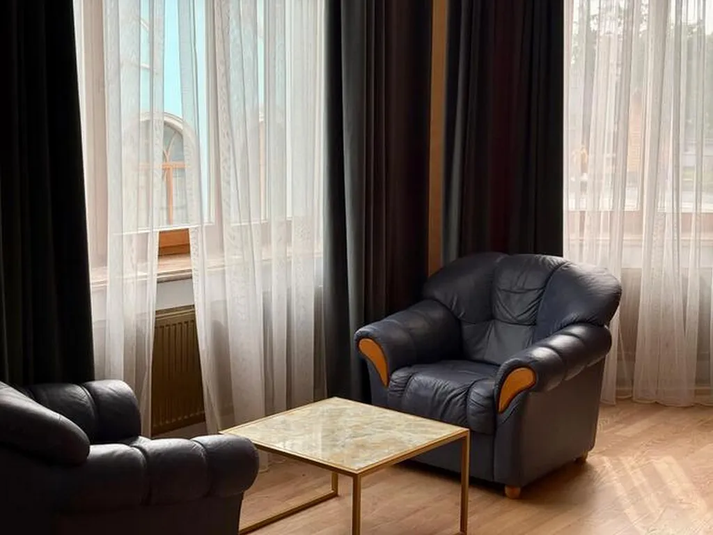 Имеется сейф, телевизор, кондиционер, шкаф, вешалка, рабочий стол, журнальный столик, чайник, холодильник, стулья.