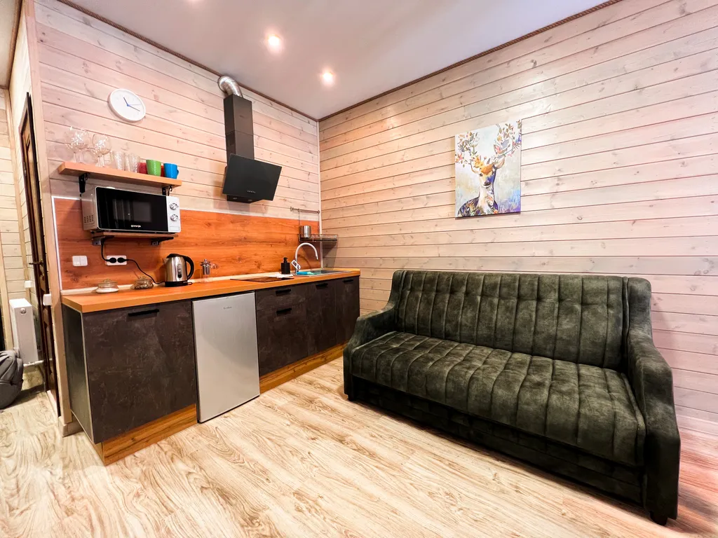 На кухне имеется все необходимое для приготовления пищи: холодильник, микроволновая печь, чайник, варочная панель, вытяжка и т.д.. На территории есть барбекю зона, беседки, детская площадка. В качестве дополнительных услуг: баня на дровах, банный чан, отапливаемые и застекленные беседки.