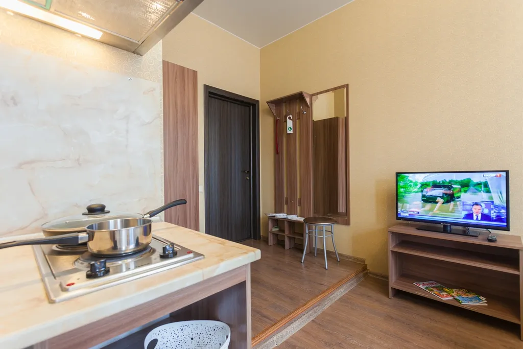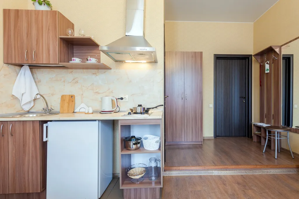 Мини кухня: холодильник, чайник, посуда, электрическая плита. Набор белья, полотенца 70*1400, 50*90.