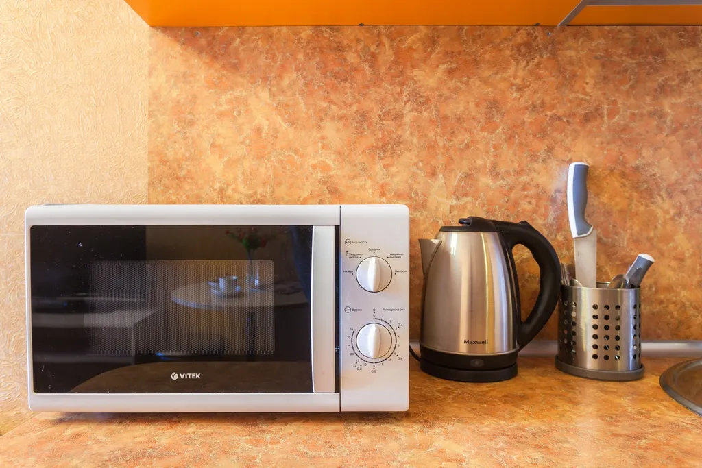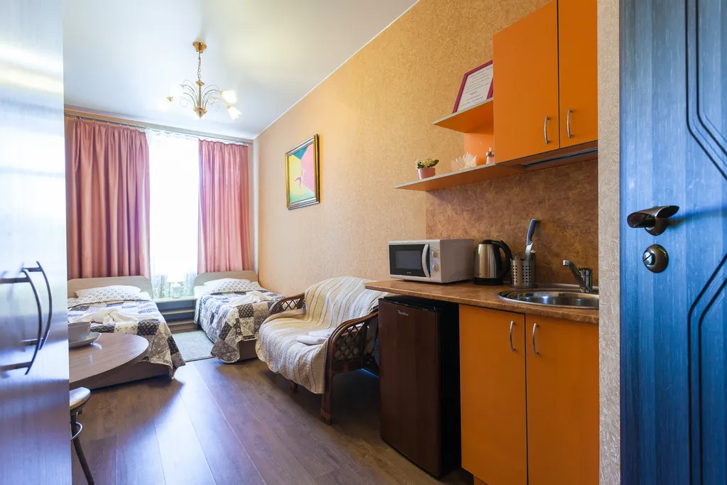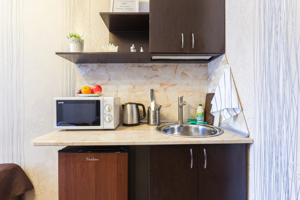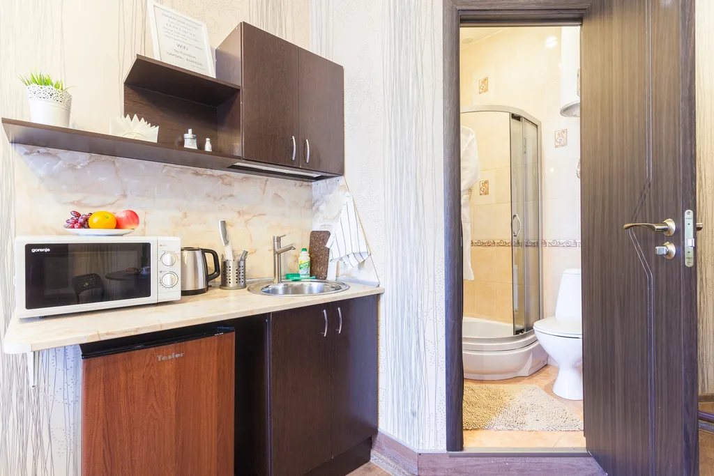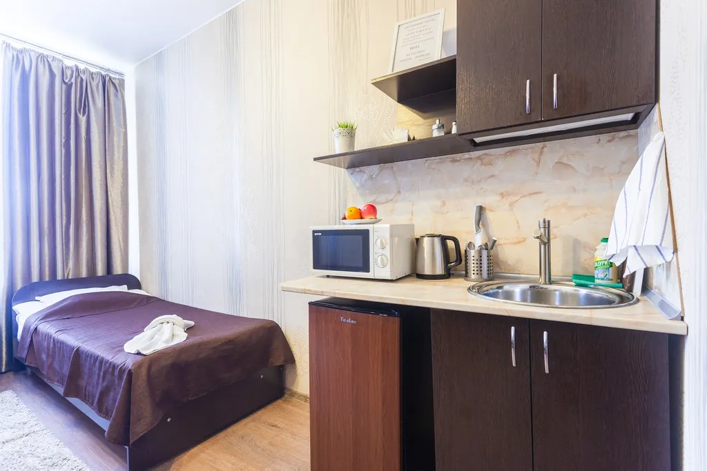 Мини кухня: холодильник, чайник, посуда, микроволновая печь. Набор белья, полотенца 70*1400, 50*90.