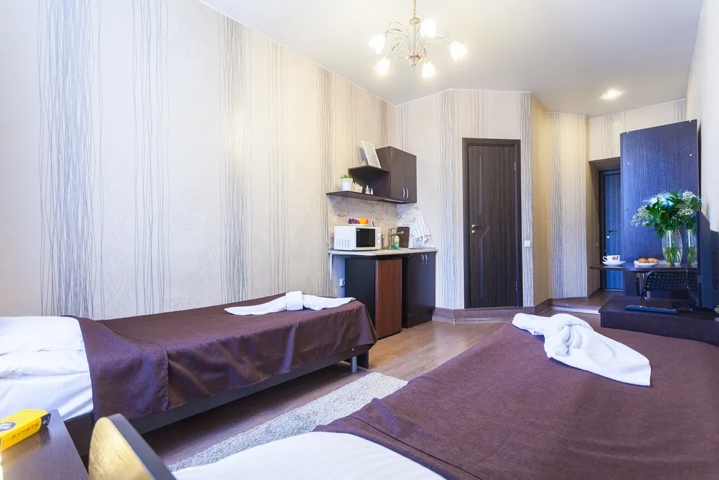 Оборудование: телевизор, две кровати 90*2000, шкаф, зеркало, стол, стулья.