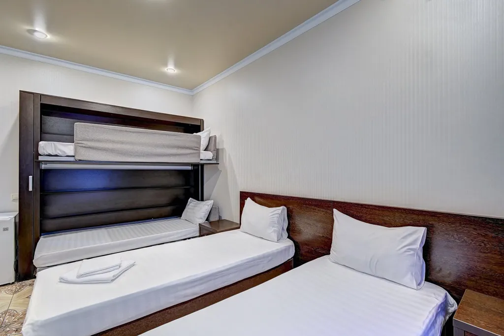 В номере предусмотрены четыре спальных места: как правило, это двуспальная кровать и две односпальные кровати либо две односпальные кровати и раскладной диван. Зонирование пространства с помощью штор или арочного проёма создаёт дополнительный уют и ощущение уединения.