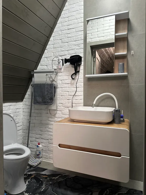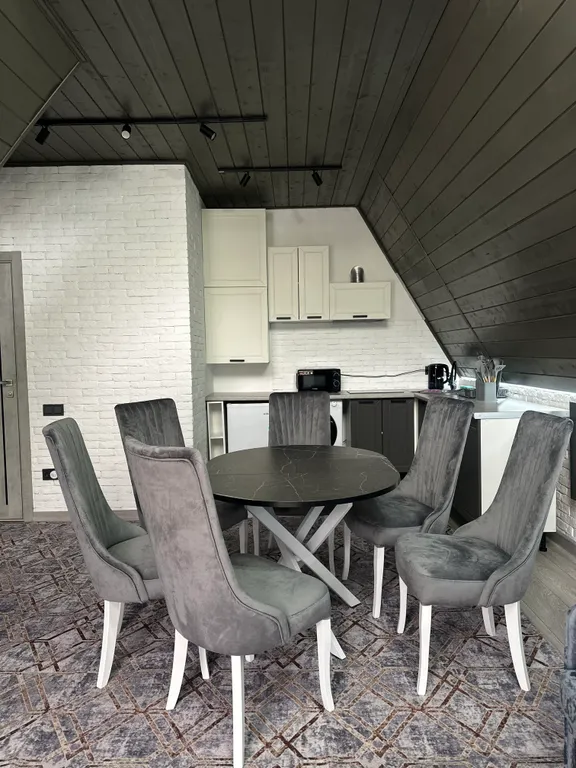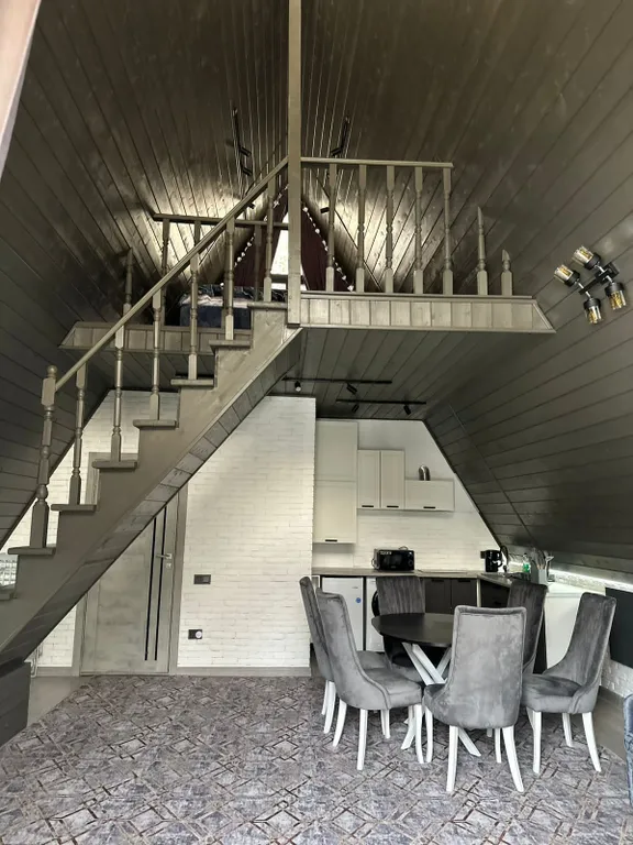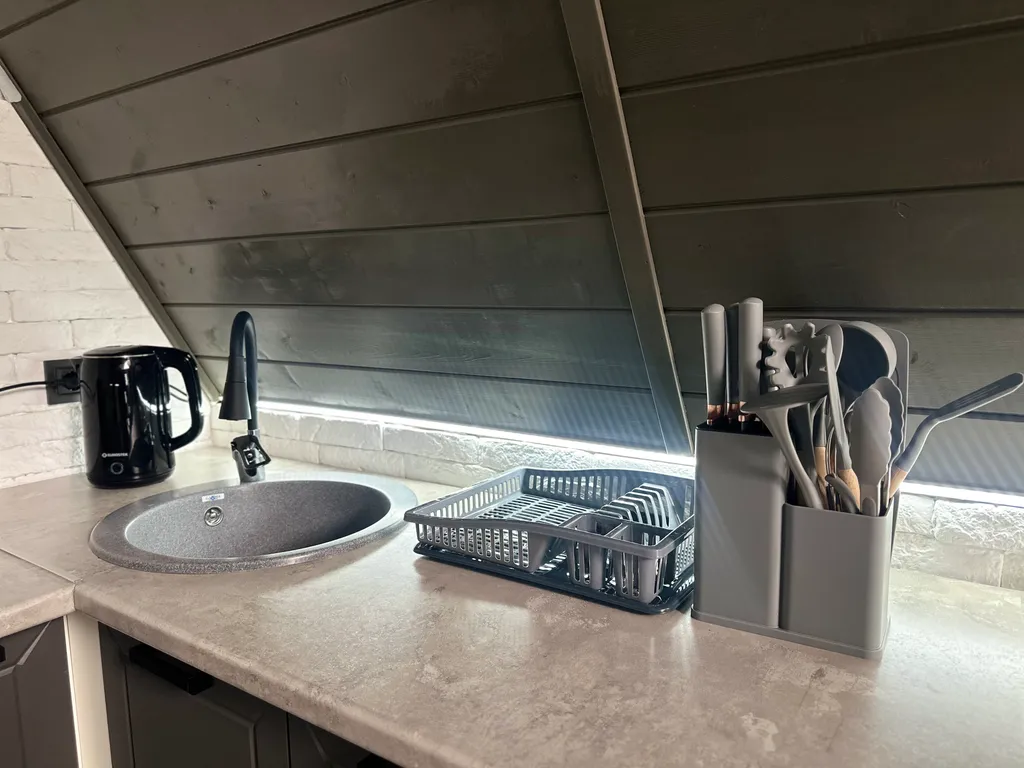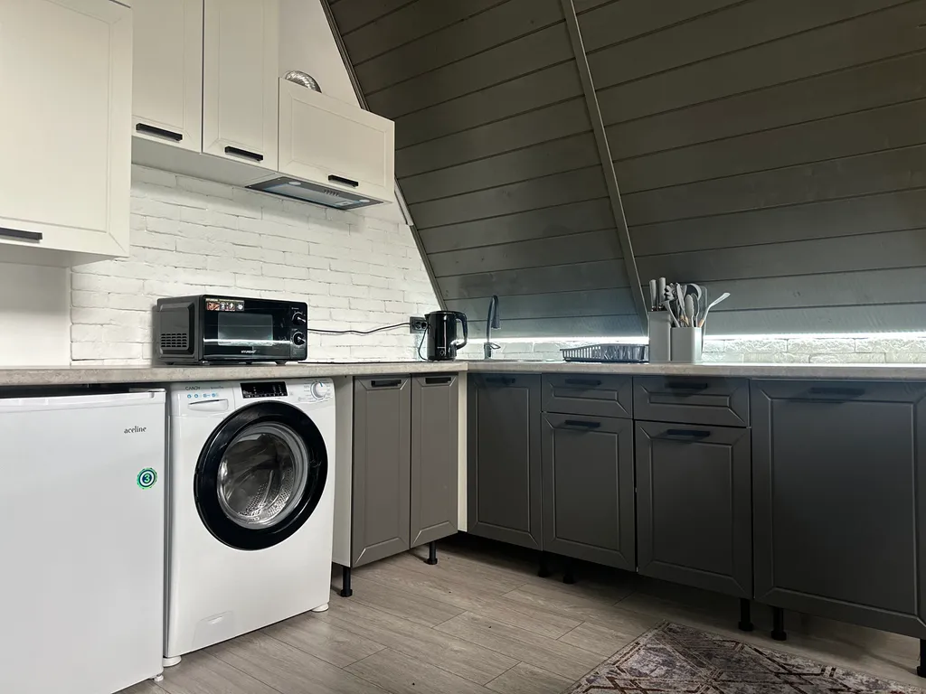 1 этаж: кухня - гостиная с оборудованной кухонной зоной, (холодильник, микроволновая печь,чайник, стиральная машина, посуда), телевизором, двуспальным диваном и совмещённым санузлом.