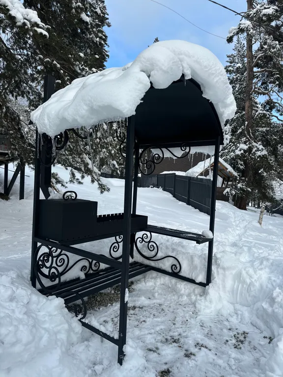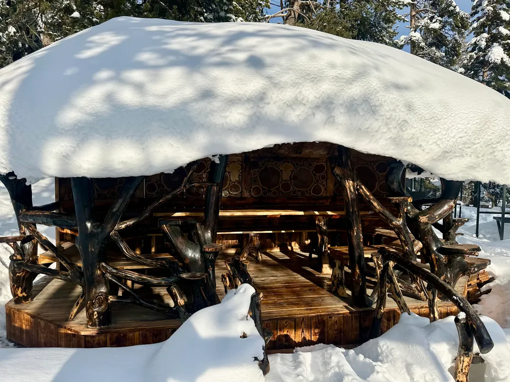 Есть мангальная, очаговая зона и большая беседка в природном стиле.