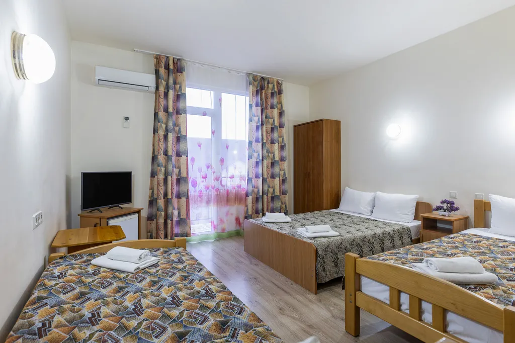 В номере имеется собственный просторный балкон с летней мебелью. Красивый вид. Из номера открывается красивый вид на море.